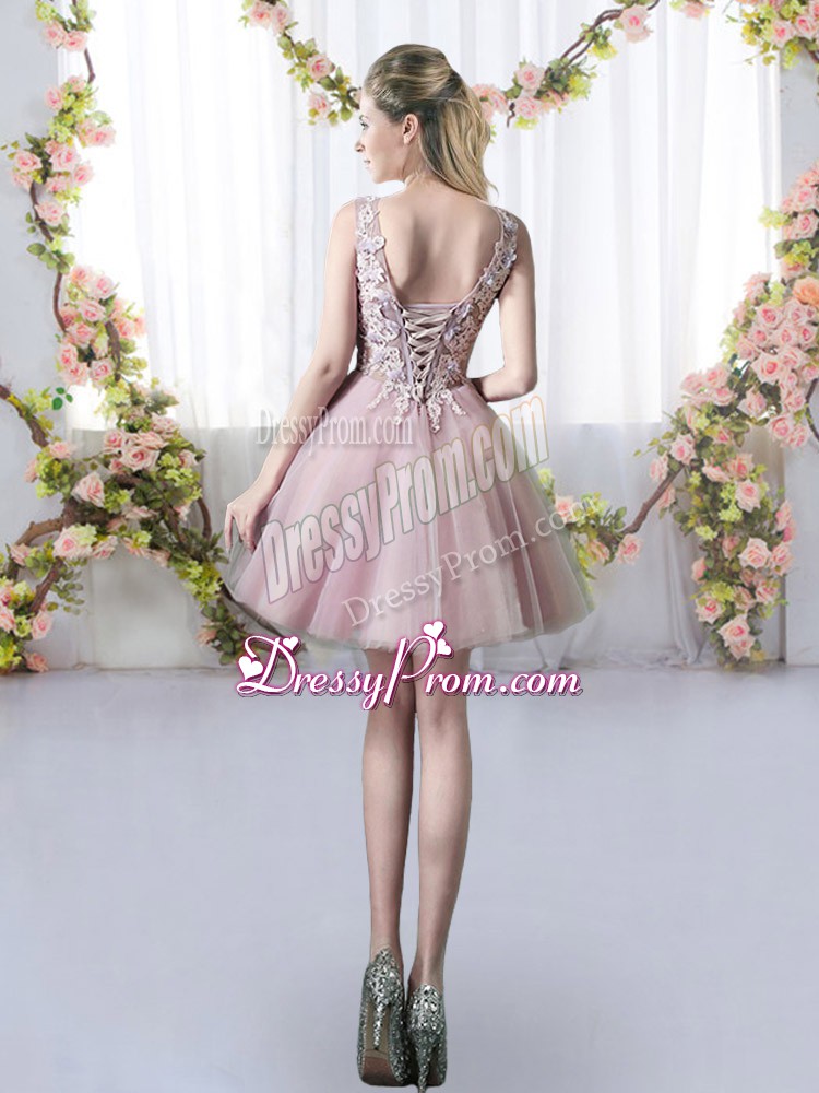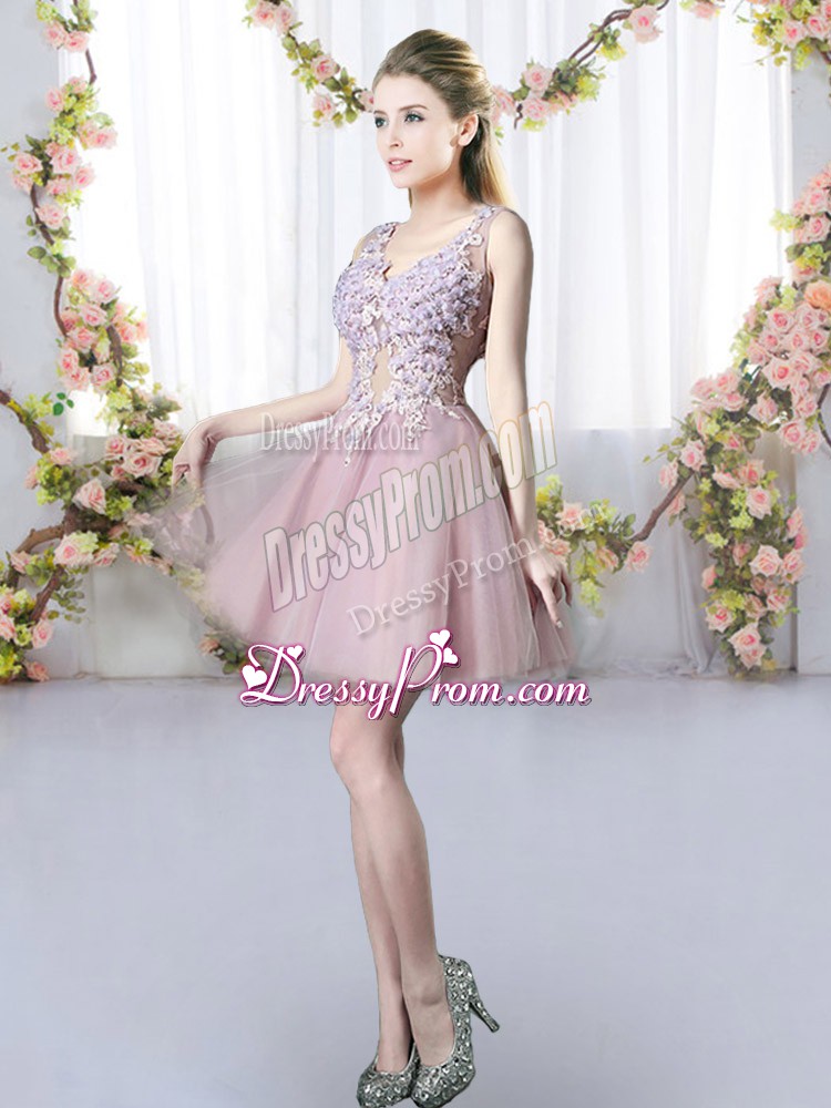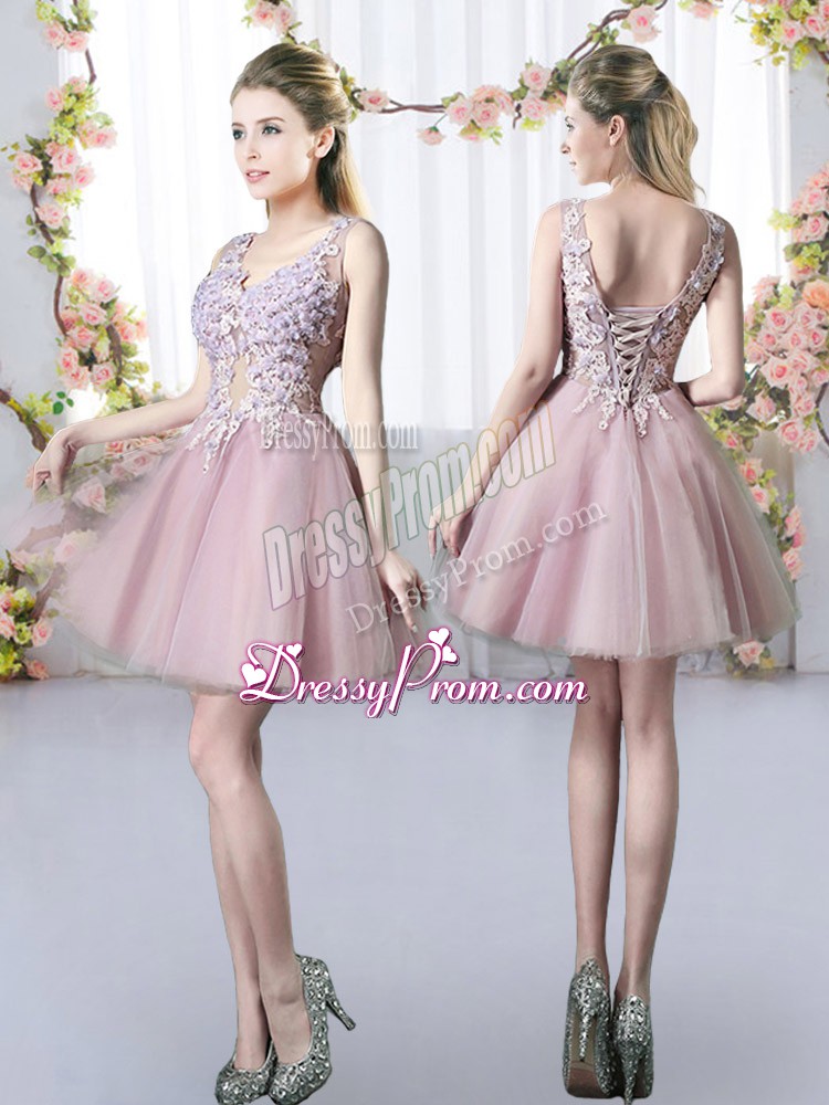 Neckline : V-neckShown Color : Pink Silhouette : A-lineSleeve Length : sleevelessHemline : mini lengthBack Detail : Lace upFabric : TulleEmbellishment : AppliquesOccasion : Prom,Party,Wedding PartySeason : Spring,Summer,Fall