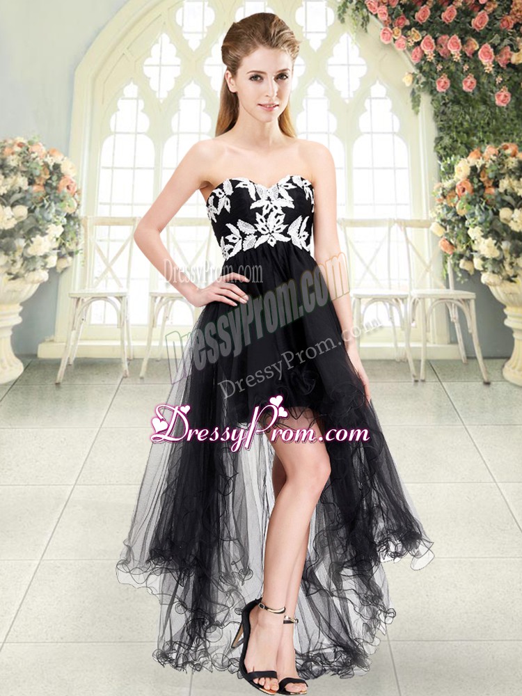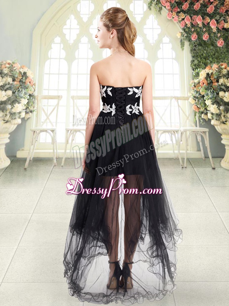 Neckline : SweetheartShown Color : BlackSilhouette : A-lineSleeve Length : sleevelessHemline : high lowBack Detail : Lace upFabric : TulleEmbellishment : AppliquesOccasion : Prom,PartySeason : Spring,Summer,Fall,Winter