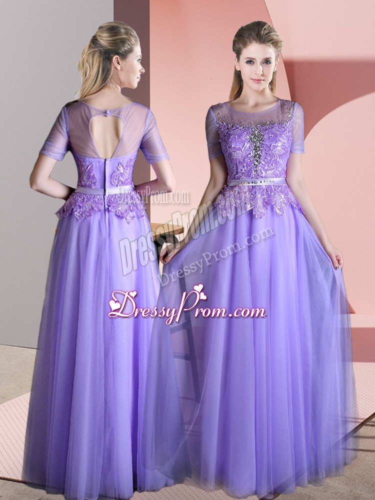 Neckline : ScoopShown Color : LavenderSilhouette : EmpireSleeve Length : short sleevesHemline : floor lengthBack Detail : BacklessFabric : TulleEmbellishment : Beading,LaceOccasion : Prom,PartySeason : Spring,Summer,Fall,Winter