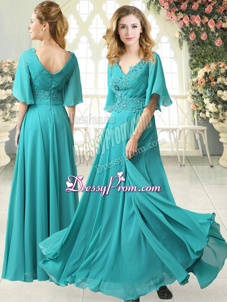 Neckline : V-neckShown Color : Aqua BlueSilhouette : EmpireSleeve Length : half sleevesHemline : floor lengthBack Detail : ZipperFabric : ChiffonEmbellishment : Beading,LaceOccasion : Prom,PartySeason : Spring,Summer,Fall,Winter