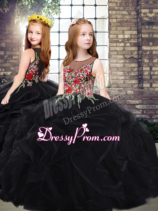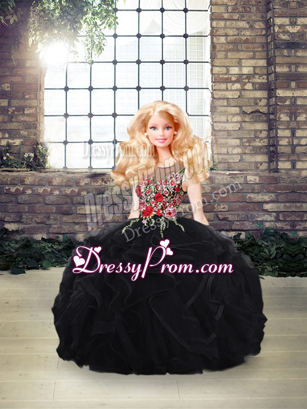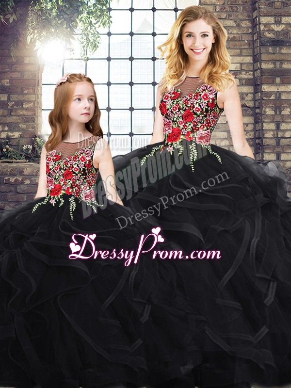 Dynamic Black Sleeveless Floor Length Embroidery and Ruffles Zipper Sweet 16 Dress