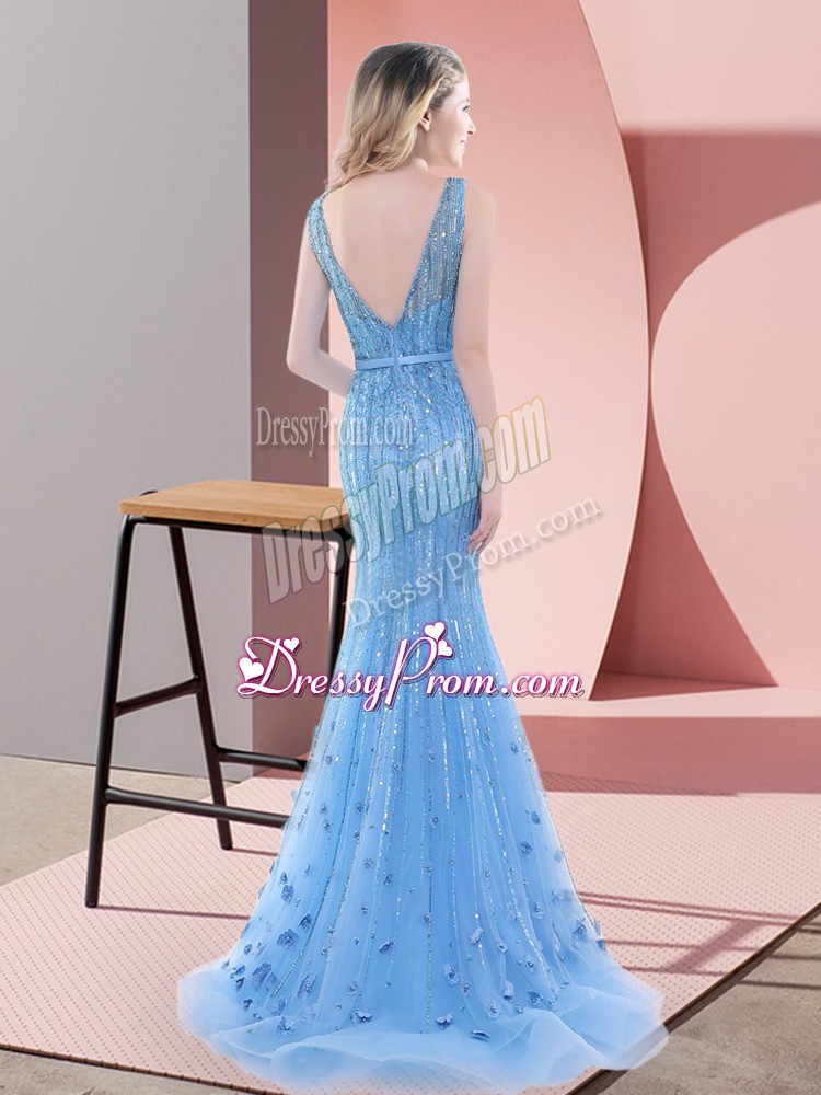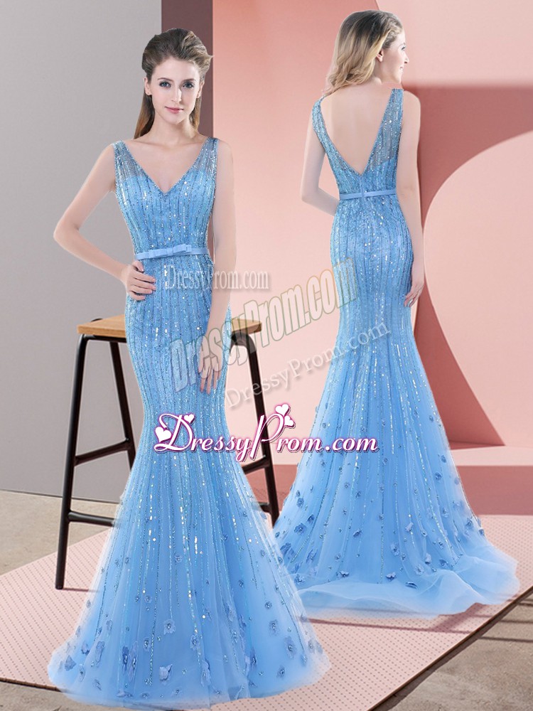 Neckline : V-neckShown Color : Baby BlueSilhouette : MermaidSleeve Length : sleevelessBack Detail : BacklessFabric : TulleEmbellishment : Beading,SequinsOccasion : Prom,Party,Military BallSeason : Spring,Summer,Fall,Winter