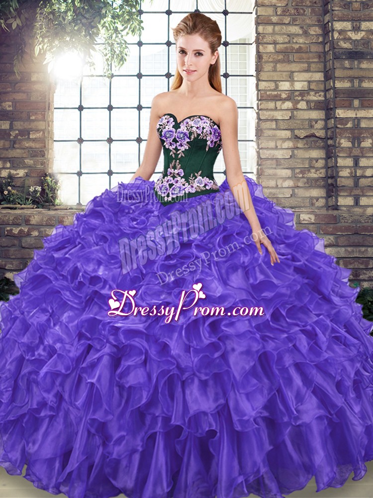 Neckline : SweetheartShown Color : PurpleSilhouette : Ball GownsSleeve Length : sleevelessBack Detail : Lace upFabric : OrganzaEmbellishment : Embroidery,RufflesOccasion : Military Ball,Sweet 16,QuinceaneraSeason : Spring,Summer,Fall,Winter