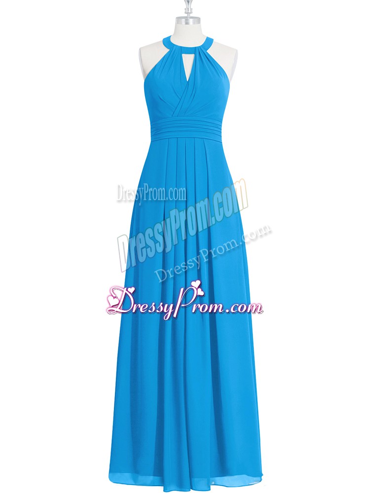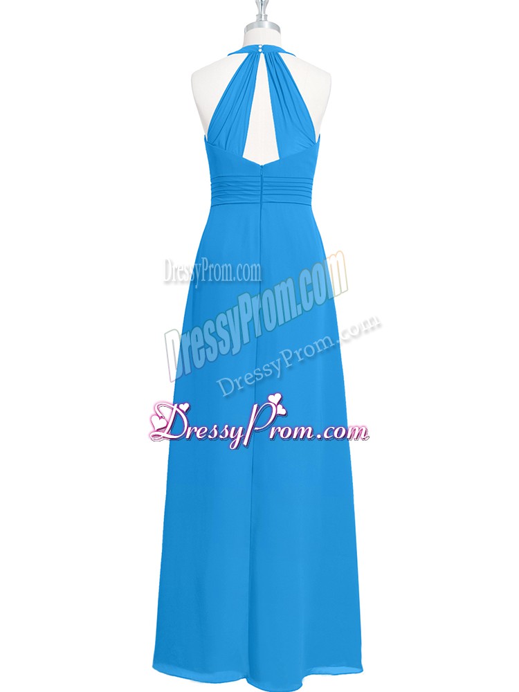 Neckline : Halter topShown Color : BlueSilhouette : EmpireSleeve Length : sleevelessHemline : floor lengthBack Detail : ZipperFabric : ChiffonEmbellishment : RuchingOccasion : Prom,PartySeason : Spring,Summer,Fall,Winter