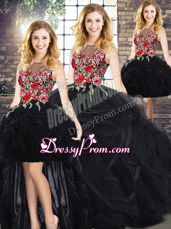 New Style Black Sleeveless Floor Length Embroidery and Ruffles Zipper Quinceanera Gowns