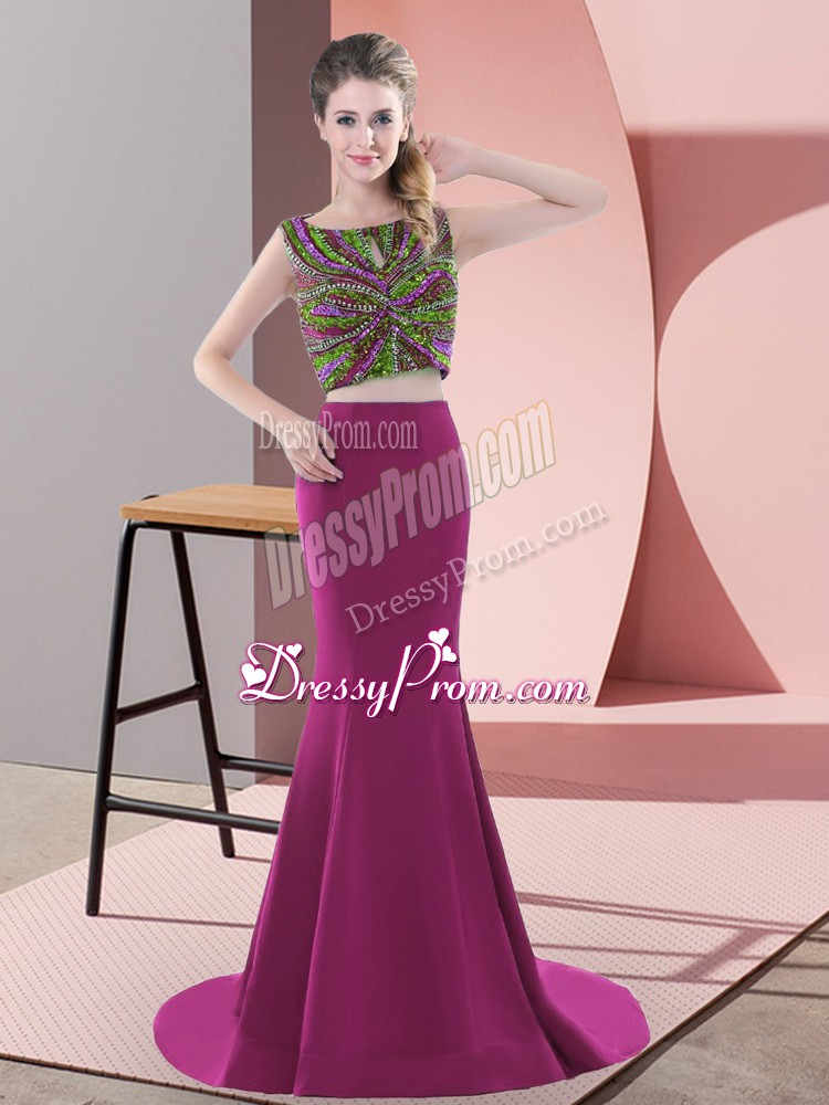 Neckline : ScoopShown Color : FuchsiaSilhouette : Two PiecesSleeve Length : sleevelessBack Detail : BacklessFabric : SatinEmbellishment : BeadingOccasion : Prom,PartySeason : Spring,Summer,Fall,Winter