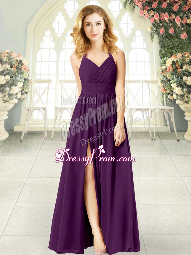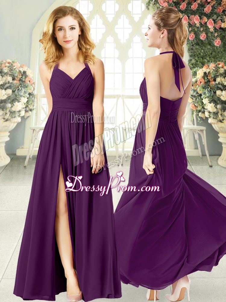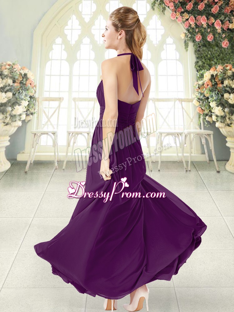 Neckline : Halter topShown Color : PurpleSilhouette : EmpireSleeve Length : sleevelessHemline : floor lengthBack Detail : BacklessFabric : ChiffonEmbellishment : RuchingOccasion : Prom,PartySeason : Spring,Summer,Fall,Winter