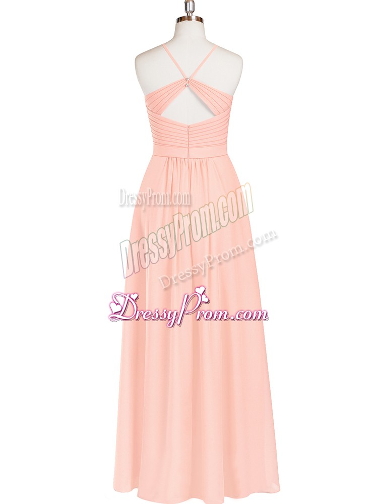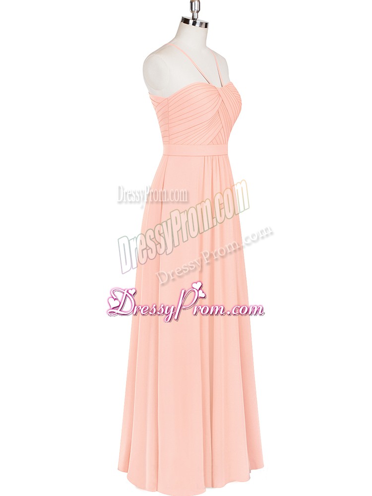 Neckline : Halter topShown Color : Pink Silhouette : EmpireSleeve Length : sleevelessHemline : floor lengthBack Detail : ZipperFabric : ChiffonEmbellishment : RuchingOccasion : Prom,Party,Military BallSeason : Spring,Summer,Fall,Winter