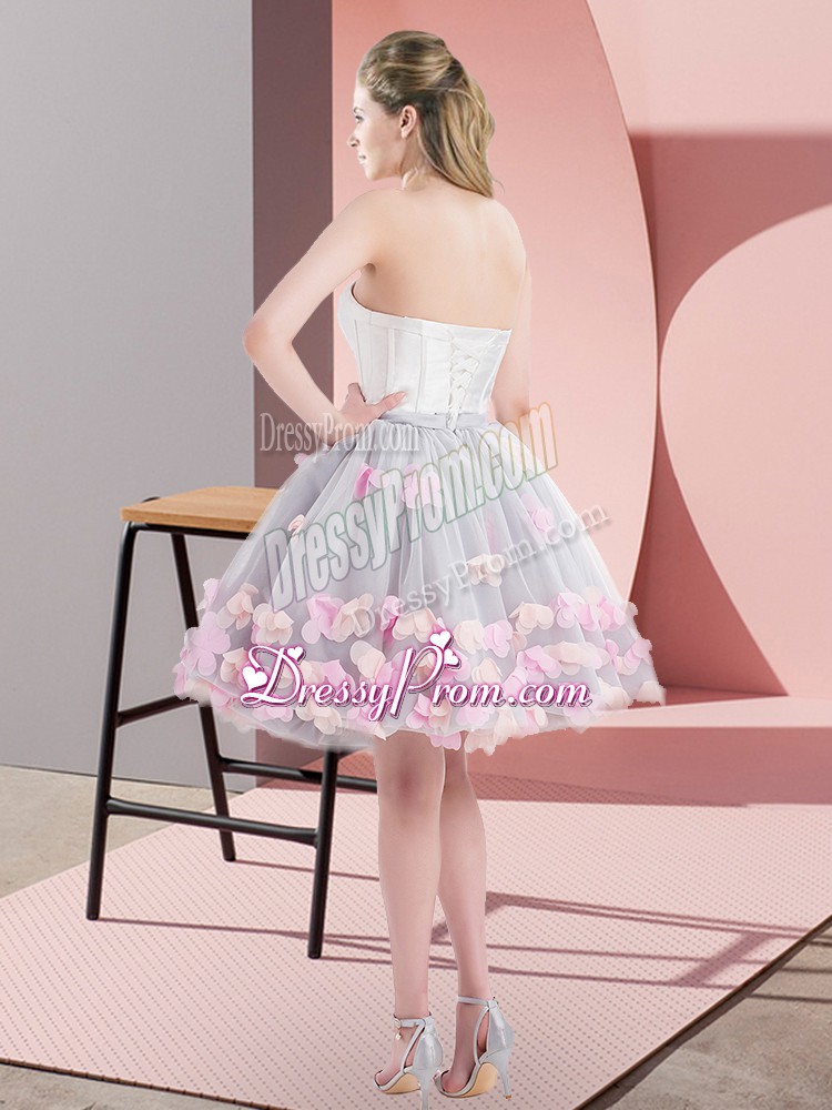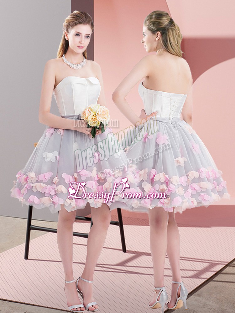 Neckline : StraplessShown Color : GreySilhouette : Ball GownsSleeve Length : sleevelessHemline : mini lengthBack Detail : Lace upFabric : TulleEmbellishment : AppliquesOccasion : Prom,PartySeason : Spring,Summer,Fall