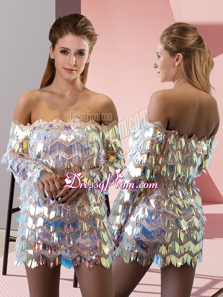 Neckline : Off the shoulderShown Color : SilverSilhouette : A-lineSleeve Length : long sleevesHemline : mini lengthFabric : SequinedEmbellishment : RuchingOccasion : Prom,PartySeason : Spring,Summer,Fall