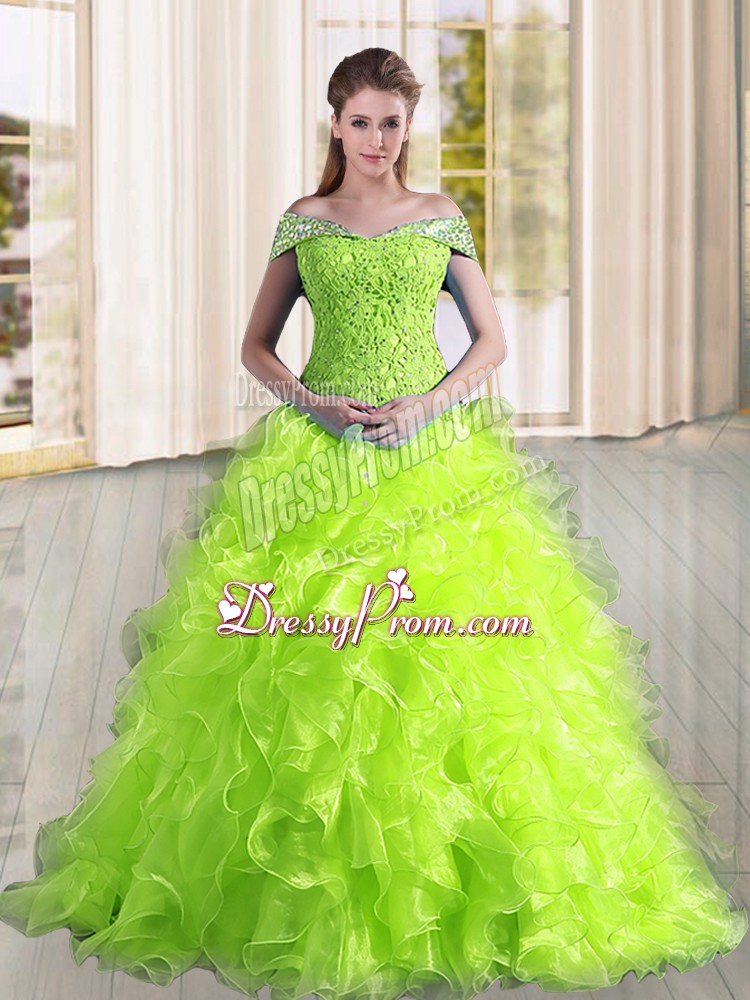 Perfect Sweep Train A-line Sweet 16 Dress Yellow Green Off The Shoulder Organza Sleeveless Lace Up