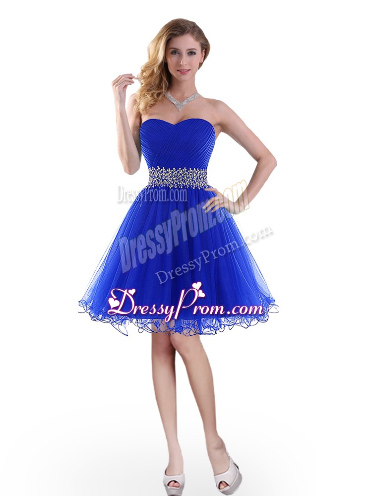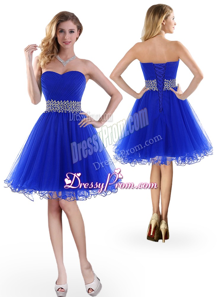 Neckline : SweetheartShown Color : Royal BlueSilhouette : A-lineSleeve Length : sleevelessHemline : knee lengthBack Detail : Lace upFabric : TulleEmbellishment : BeadingOccasion : Prom,PartySeason : Spring,Summer,Fall