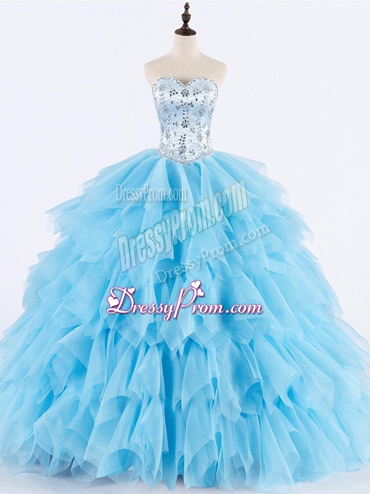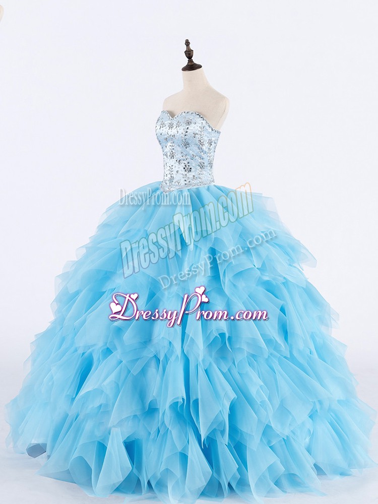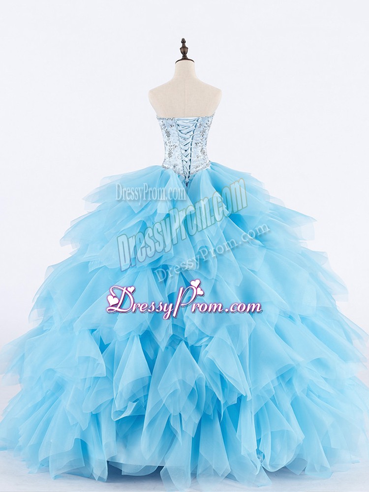 Baby Blue Ball Gowns Sweetheart Sleeveless Tulle Floor Length Lace Up Beading and Ruffles Quinceanera Dress