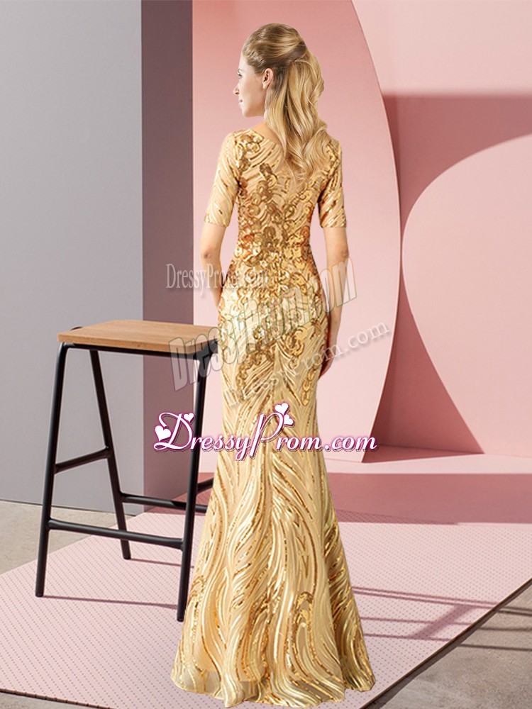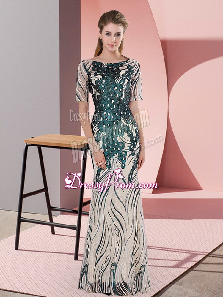 Neckline : ScoopShown Color : GreenSilhouette : MermaidSleeve Length : half sleevesHemline : floor lengthBack Detail : ZipperEmbellishment : SequinsOccasion : Prom,PartySeason : Spring,Summer,Fall,Winter