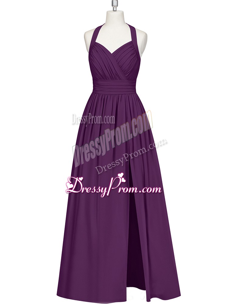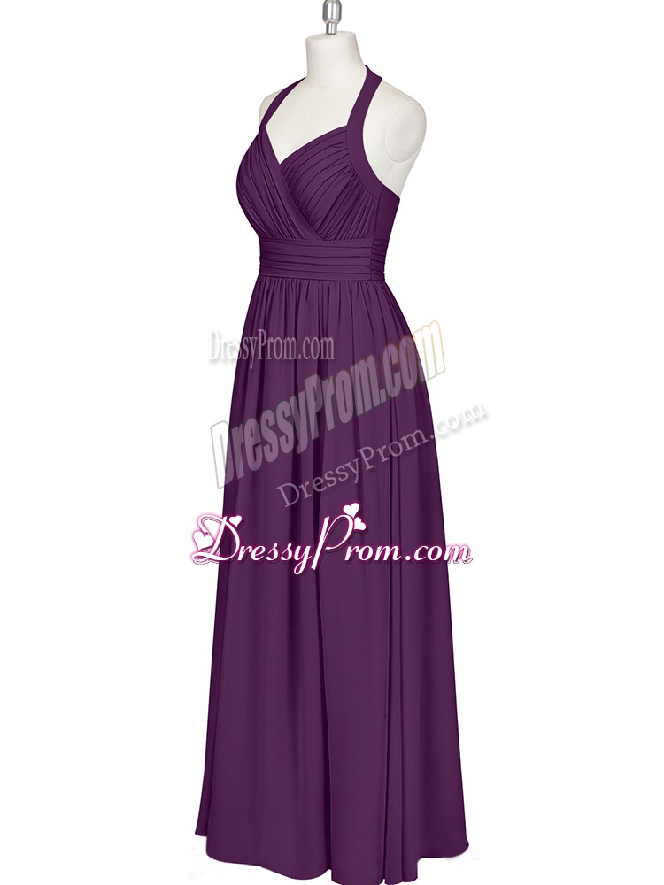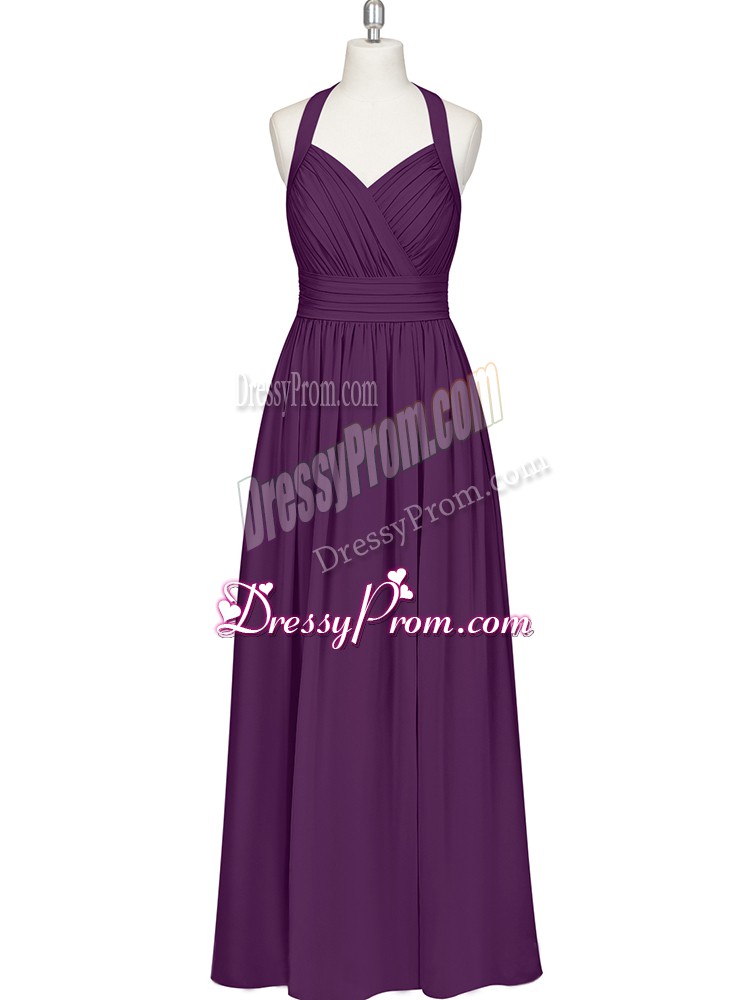 Eggplant Purple A-line Halter Top Sleeveless Chiffon Floor Length Zipper Ruching Prom Evening Gown
