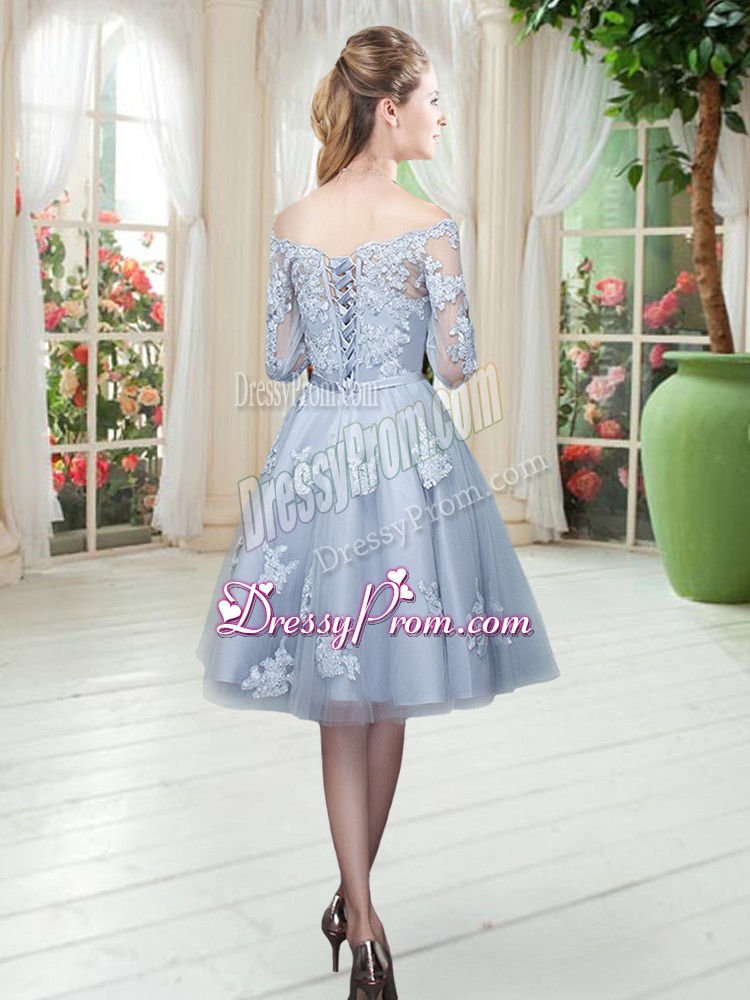 Neckline : StraplessShown Color : GreySilhouette : A-lineSleeve Length : 3|4 length sleeveHemline : knee lengthBack Detail : Lace upFabric : TulleEmbellishment : AppliquesOccasion : Prom,PartySeason : Spring,Summer,Fall