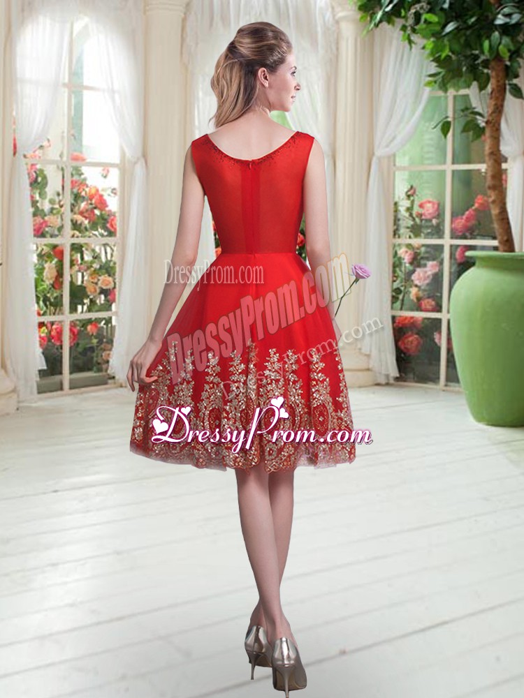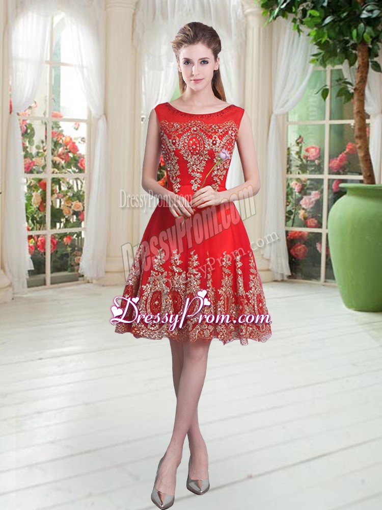 Neckline : ScoopShown Color : RedSilhouette : EmpireSleeve Length : sleevelessHemline : knee lengthBack Detail : ZipperFabric : TulleEmbellishment : Beading,AppliquesOccasion : Prom,PartySeason : Spring,Summer,Fall