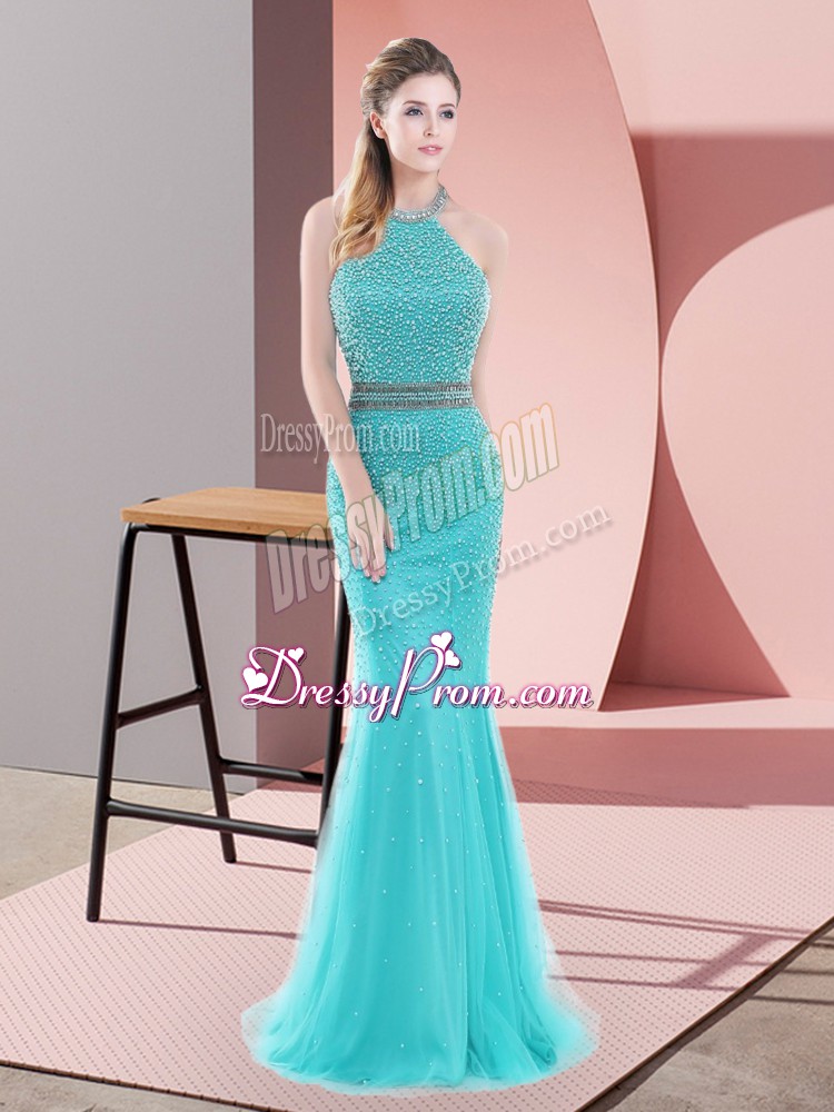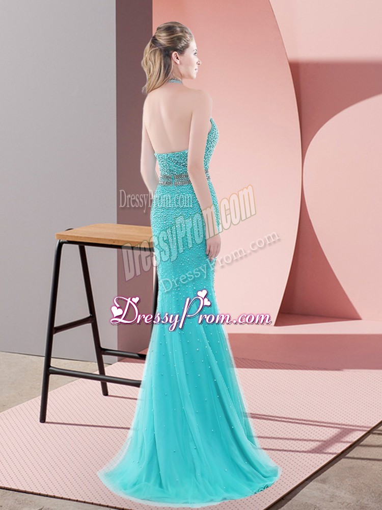 Neckline : Halter topShown Color : Aqua BlueSilhouette : MermaidSleeve Length : sleevelessBack Detail : BacklessFabric : TulleEmbellishment : BeadingOccasion : Prom,PartySeason : Spring,Summer,Fall,Winter