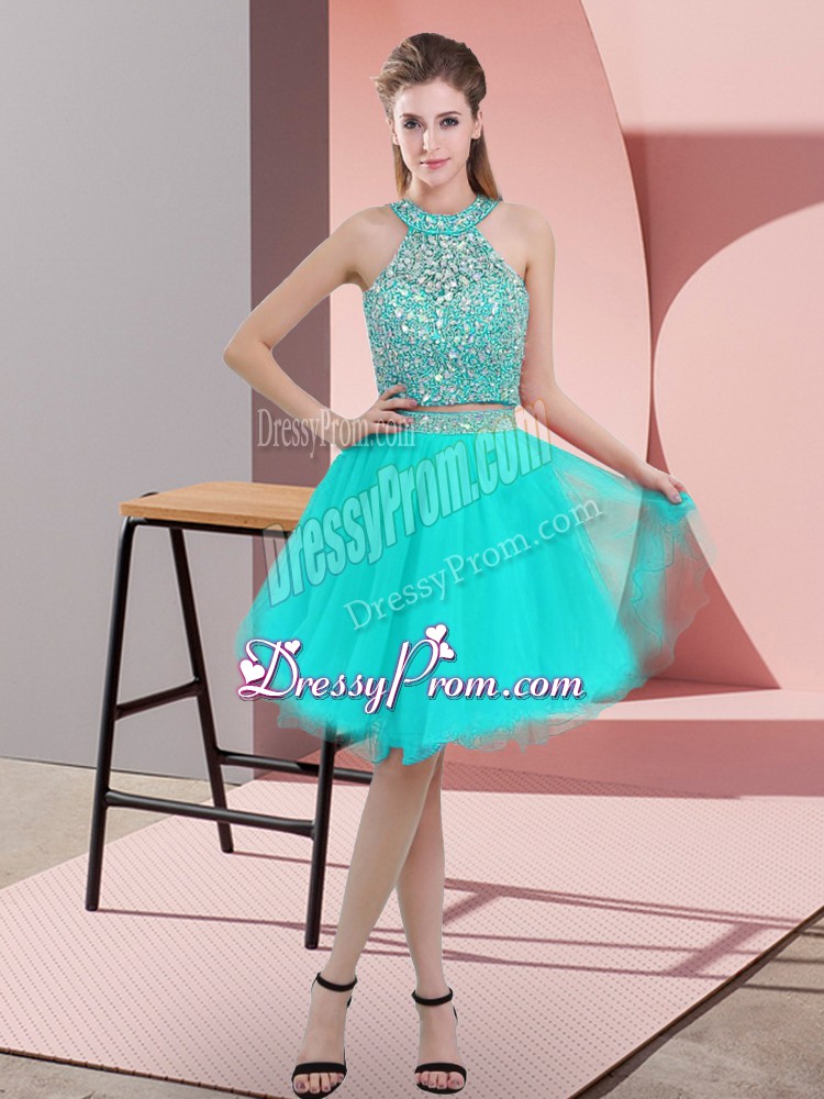 Neckline : Halter topShown Color : TurquoiseSilhouette : Two PiecesSleeve Length : sleevelessHemline : knee lengthBack Detail : BacklessFabric : OrganzaEmbellishment : BeadingOccasion : Prom,PartySeason : Spring,Summer,Fall