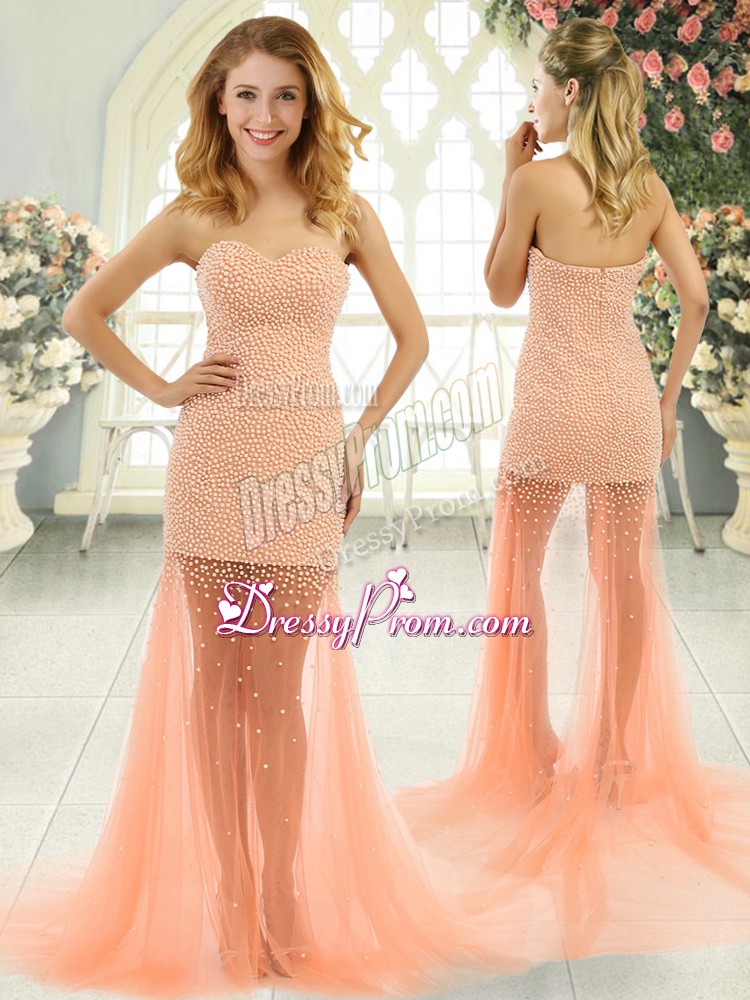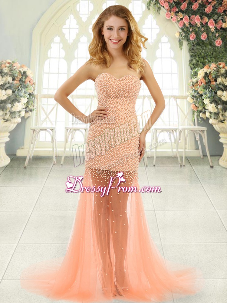 Neckline : SweetheartShown Color : Orange,PeachSilhouette : Column/SheathSleeve Length : sleevelessBack Detail : ZipperFabric : TulleEmbellishment : BeadingOccasion : Prom,PartySeason : Spring,Summer,Fall,Winter
