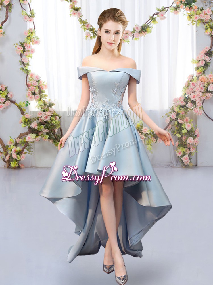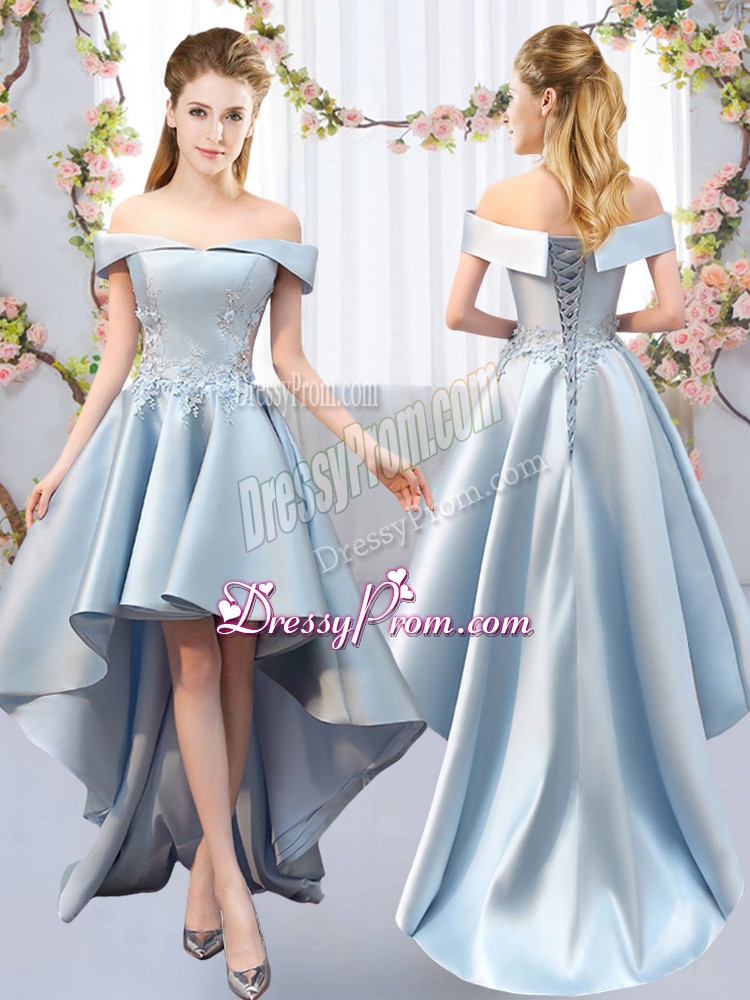 Light Blue A-line Satin Off The Shoulder Sleeveless Appliques High Low Lace Up Dama Dress