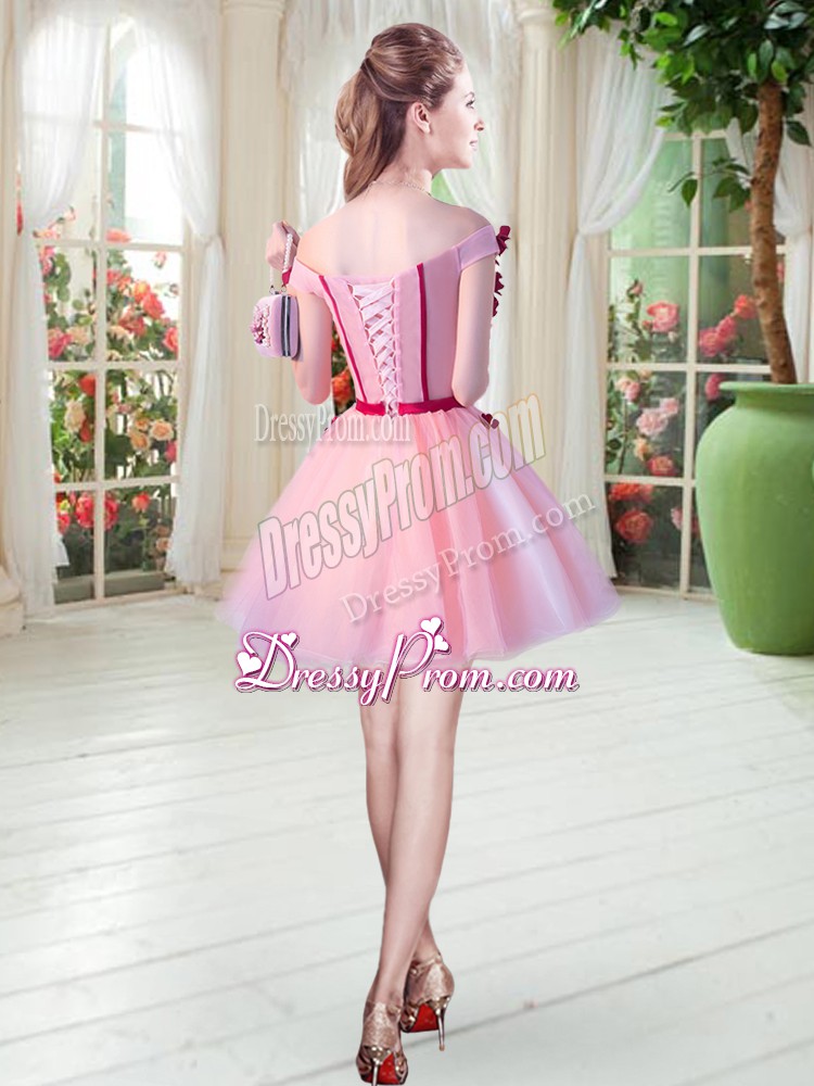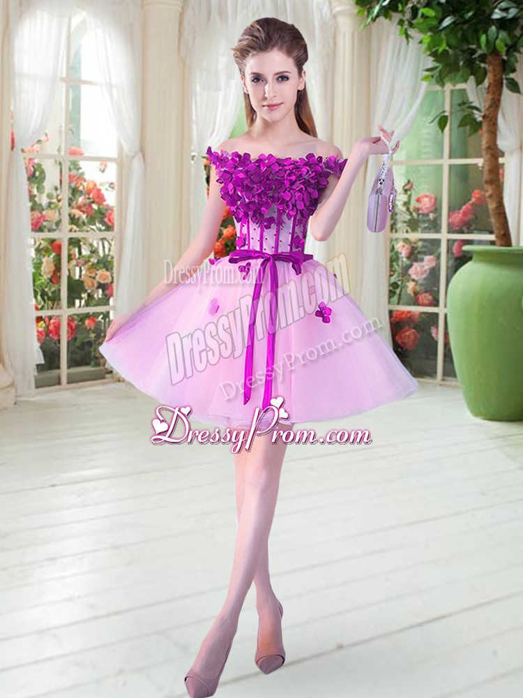 Neckline : Off the shoulderShown Color : LilacSilhouette : A-lineSleeve Length : sleevelessHemline : mini lengthBack Detail : Lace upFabric : TulleEmbellishment : Beading,AppliquesOccasion : Prom,PartySeason : Spring,Summer,Fall