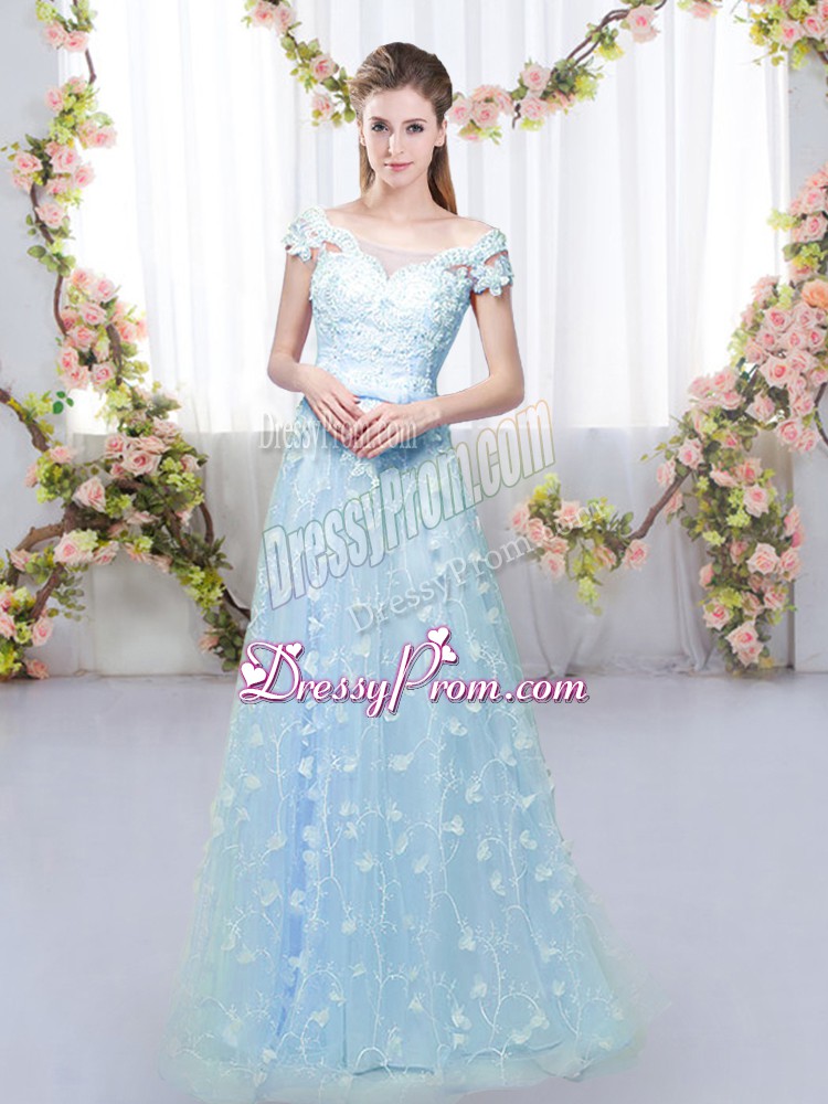 Neckline : Off the shoulder Shown Color : Blue Silhouette : Empire Sleeve Length : cap sleeves Hemline : floor length Back Detail : Lace up Fabric : Tulle Embellishment : Appliques Occasion : Prom,Party,Wedding Party Season : Spring,Summer,Fall,Winter