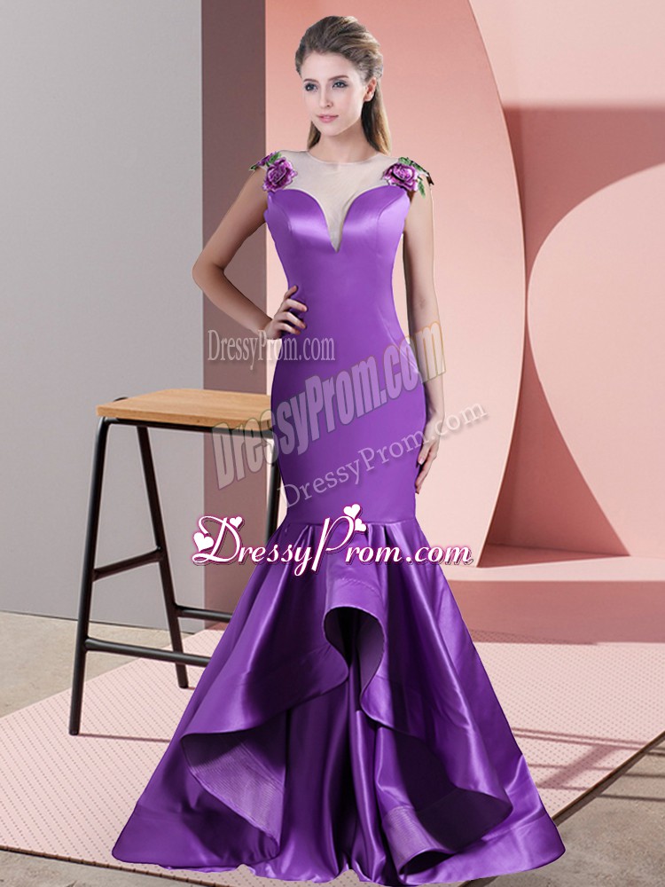 Neckline : ScoopShown Color : Eggplant PurpleSilhouette : MermaidSleeve Length : sleevelessBack Detail : Side zipperFabric : SatinEmbellishment : AppliquesOccasion : Prom,Party,Military BallSeason : Spring,Summer,Fall,Winter