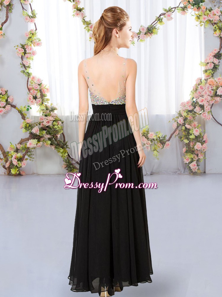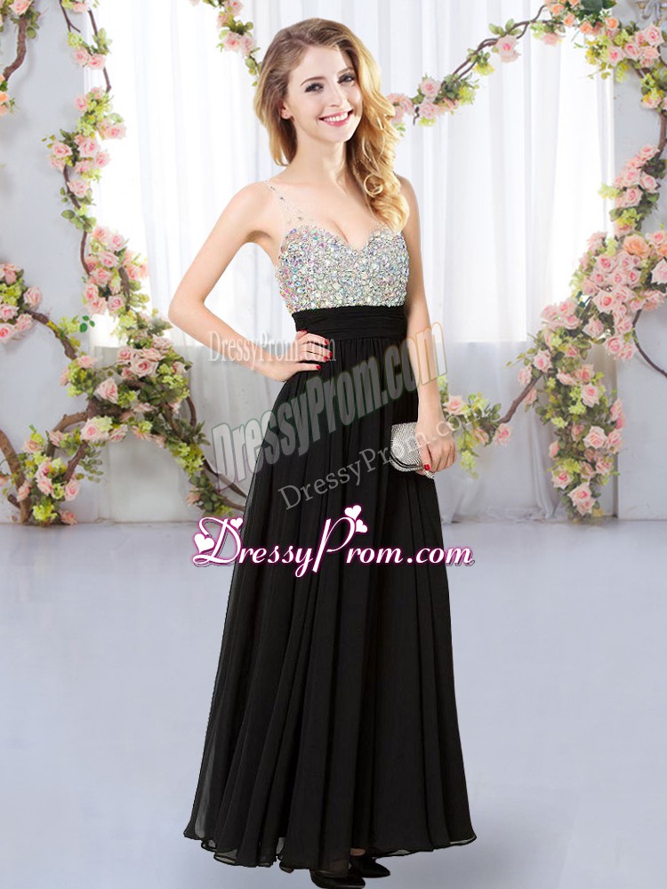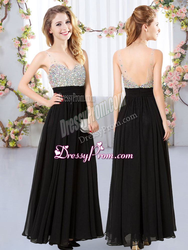 Neckline : V-neckShown Color : BlackSilhouette : EmpireSleeve Length : sleevelessHemline : floor lengthBack Detail : BacklessFabric : ChiffonEmbellishment : BeadingOccasion : Prom,Party,Wedding PartySeason : Spring,Summer,Fall,Winter