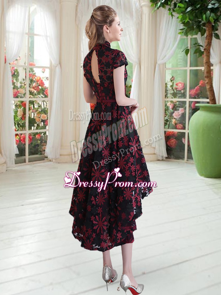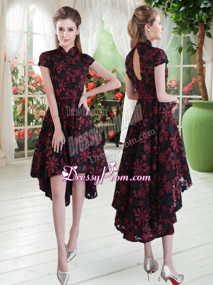 Neckline : High-neck Shown Color : Red And Black Silhouette : A-line Sleeve Length : short sleeves Hemline : high low Back Detail : Zipper Fabric : Lace Embellishment : Appliques Occasion : Prom,Party Season : Spring,Summer,Fall,Winter