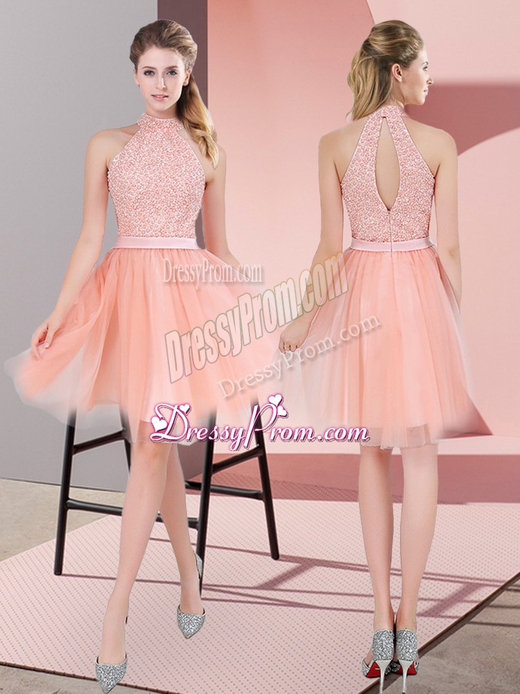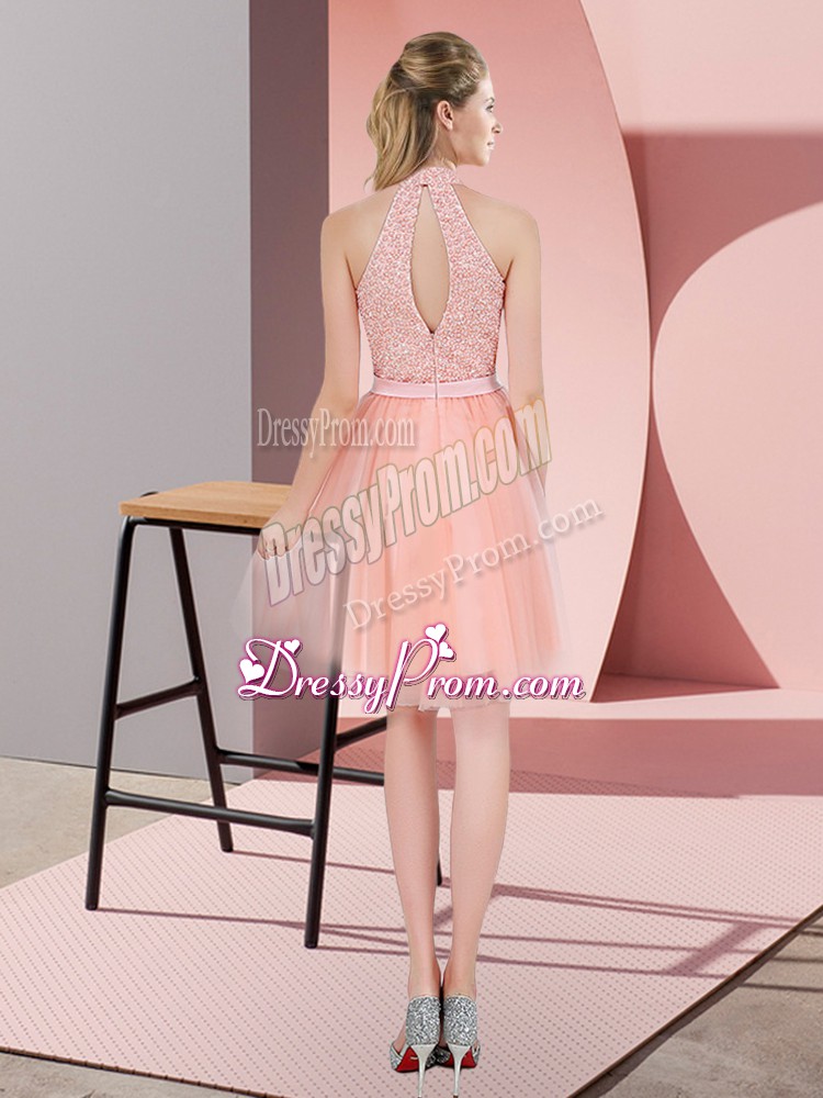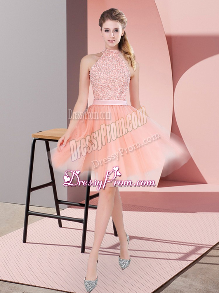 Neckline : High-neckShown Color : PeachSilhouette : A-lineSleeve Length : sleevelessHemline : knee lengthBack Detail : ZipperFabric : TulleEmbellishment : BeadingOccasion : Prom,PartySeason : Spring,Summer,Fall