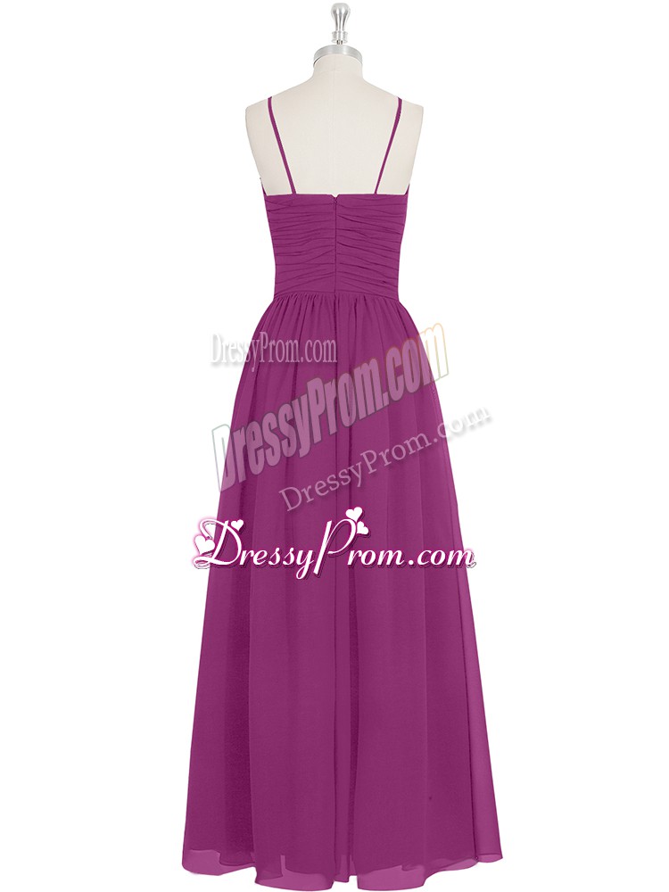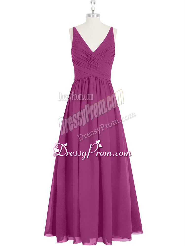 Neckline : V-neckShown Color : FuchsiaSilhouette : EmpireSleeve Length : sleevelessHemline : floor lengthBack Detail : ZipperFabric : ChiffonEmbellishment : RuchingOccasion : Prom,Party,Military BallSeason : Spring,Summer,Fall,Winter