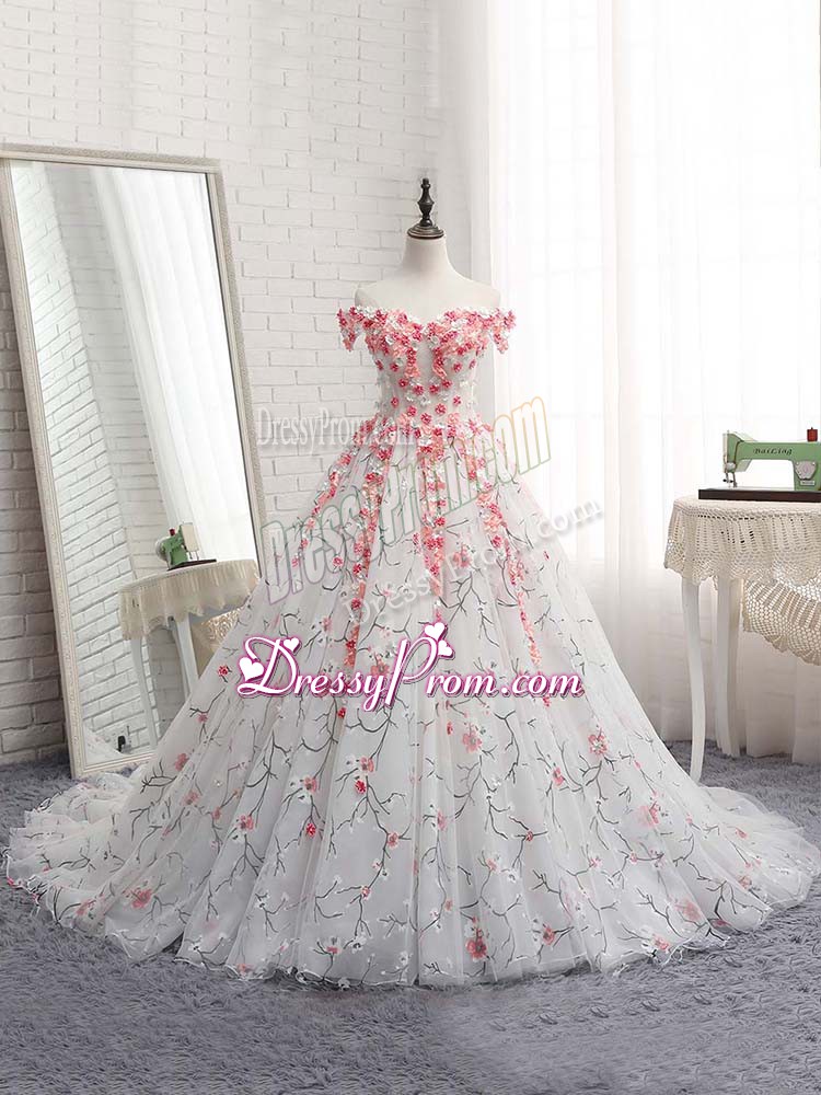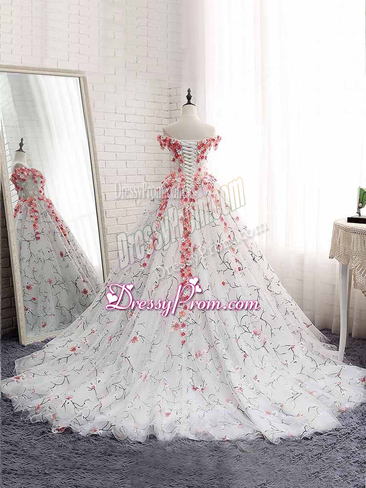 Neckline : Off the shoulder Shown Color : White Silhouette : Ball Gowns Sleeve Length : sleeveless Back Detail : Lace up Fabric : Tulle Embellishment : Appliques Occasion : Military Ball,Sweet 16,Quinceanera Season : Spring,Summer,Fall,Winter