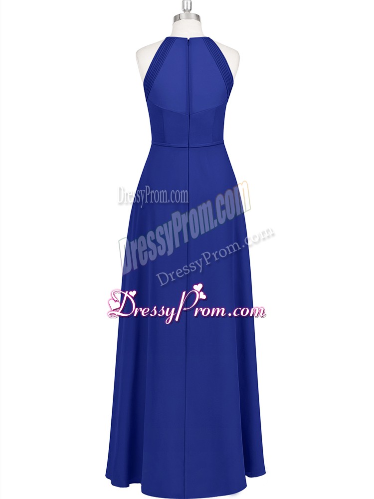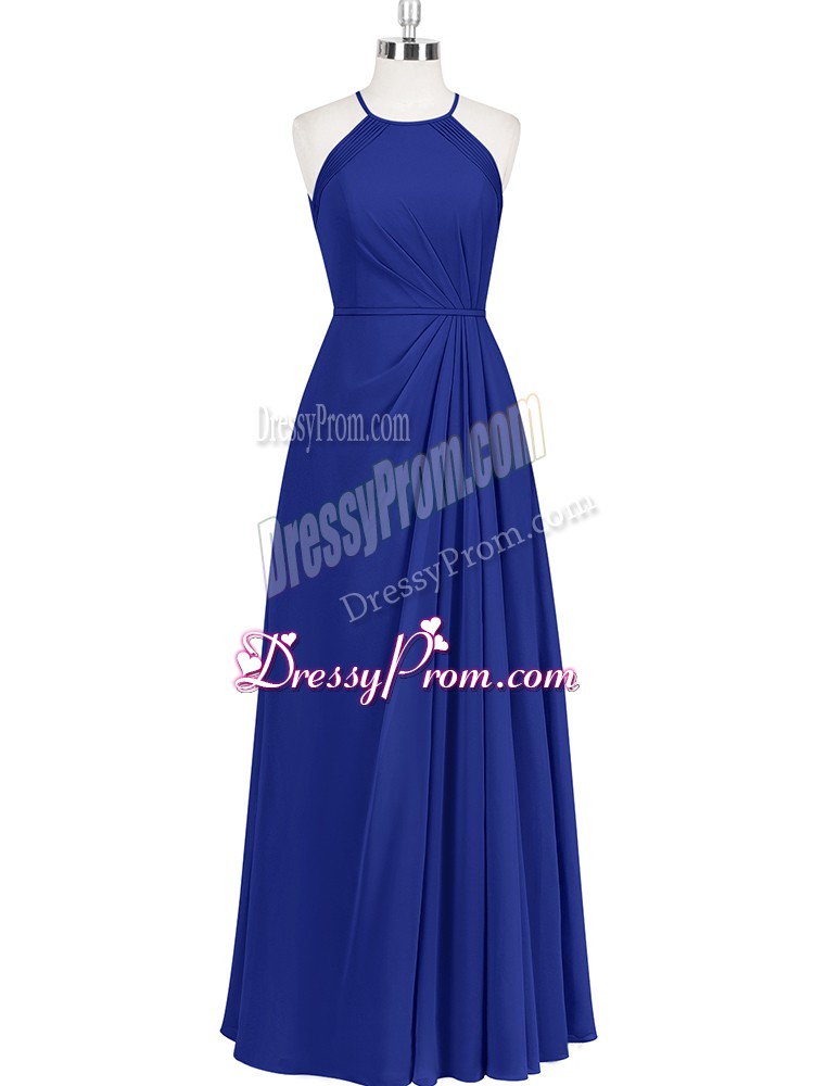 Neckline : Halter topShown Color : Royal BlueSilhouette : Column/SheathSleeve Length : sleevelessHemline : floor lengthBack Detail : ZipperFabric : ChiffonEmbellishment : RuchingOccasion : Prom,PartySeason : Spring,Summer,Fall,Winter