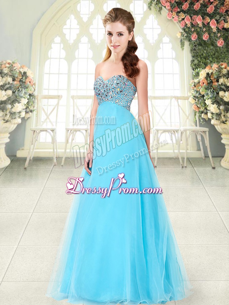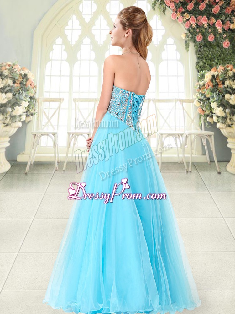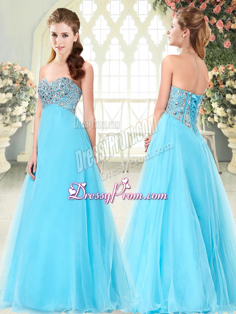 Neckline : SweetheartShown Color : Aqua BlueSilhouette : A-lineSleeve Length : sleevelessHemline : floor lengthBack Detail : Lace upFabric : TulleEmbellishment : BeadingOccasion : Prom,PartySeason : Spring,Summer,Fall,Winter