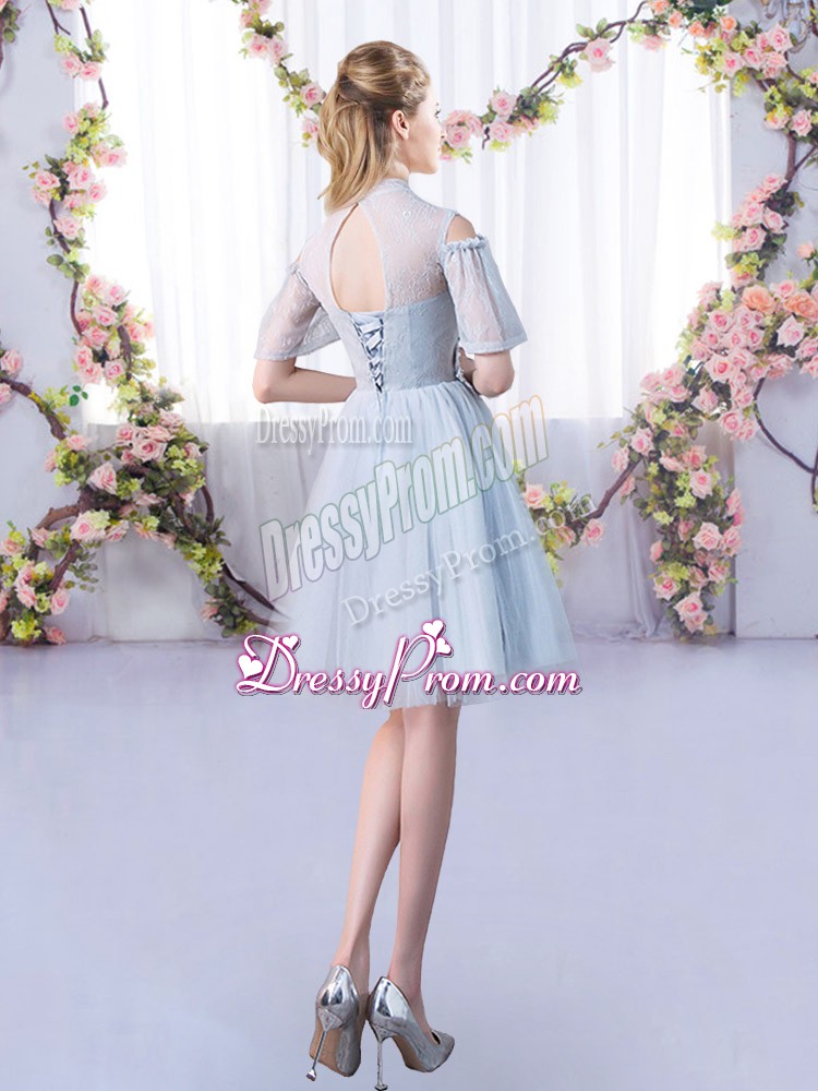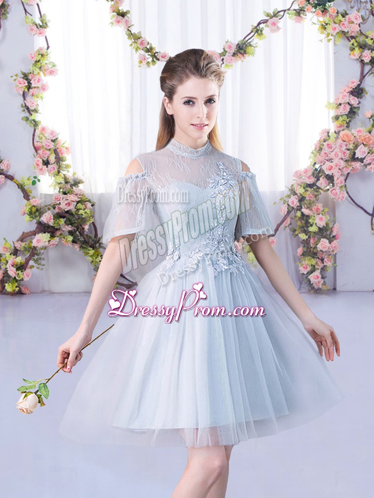 Neckline : High-neckShown Color : GreySilhouette : A-lineSleeve Length : short sleevesHemline : mini lengthBack Detail : Lace upFabric : TulleEmbellishment : LaceOccasion : Prom,Party,Wedding PartySeason : Spring,Summer,Fall