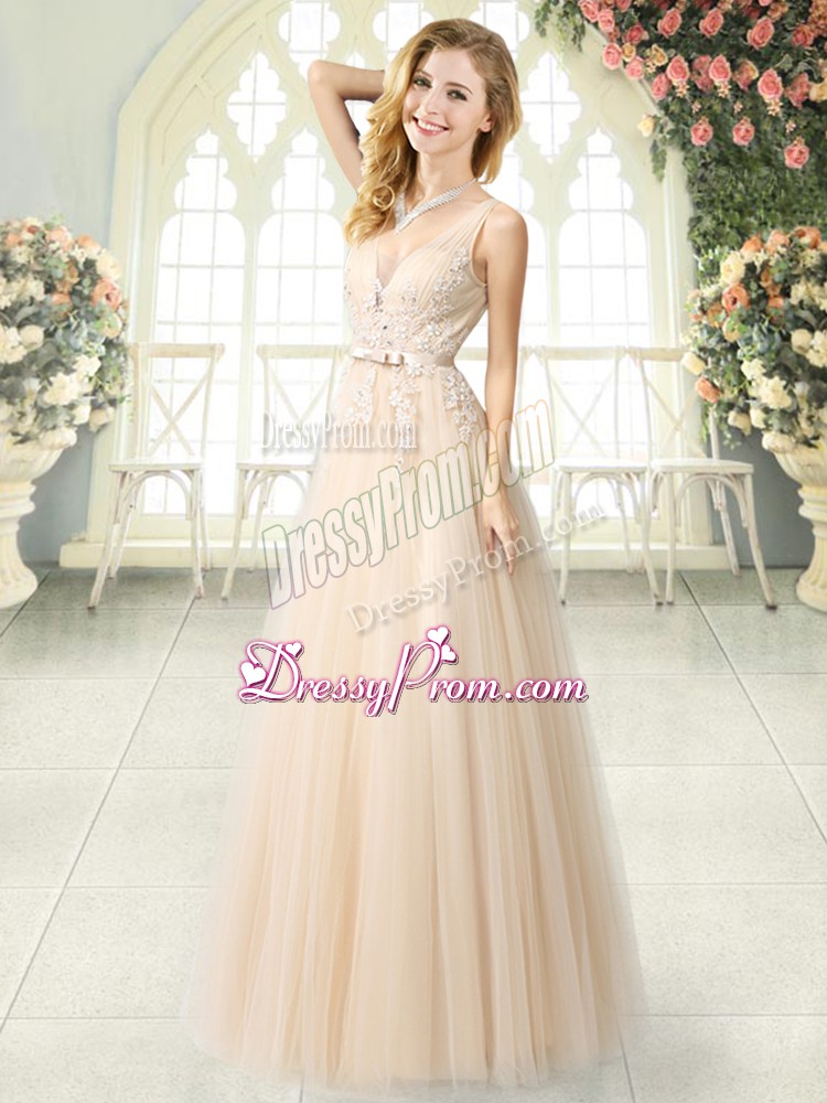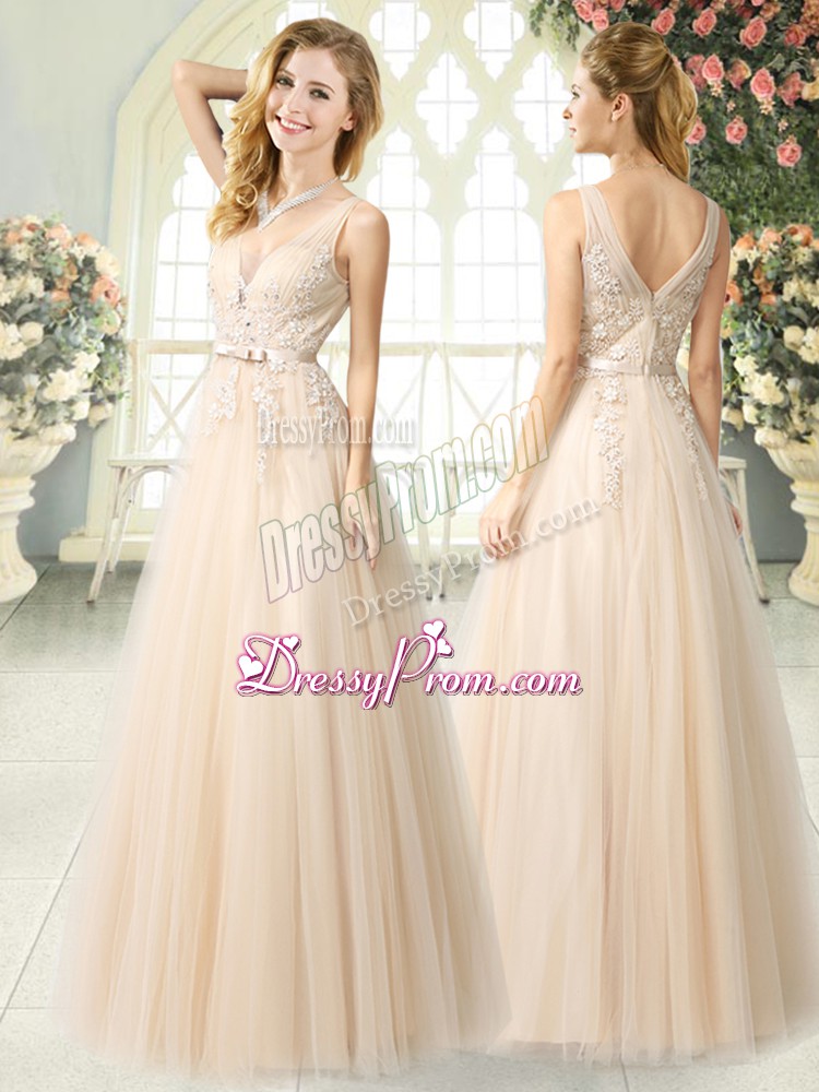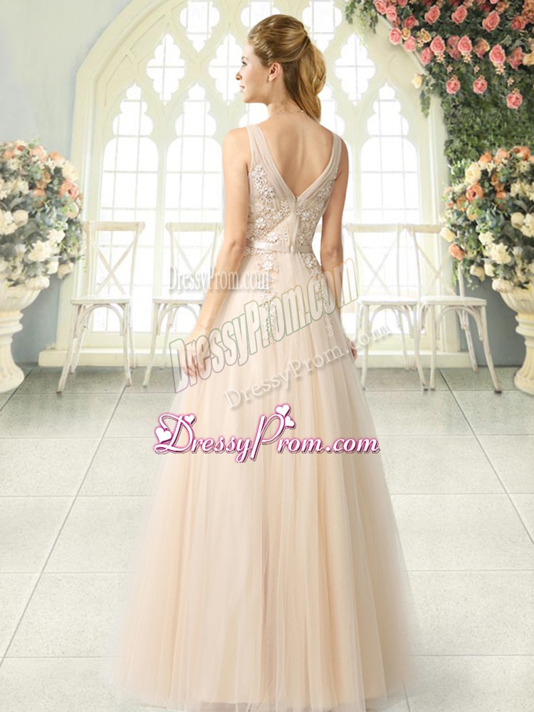 Neckline : V-neckShown Color : ChampagneSilhouette : A-lineSleeve Length : sleevelessHemline : floor lengthBack Detail : ZipperFabric : TulleEmbellishment : AppliquesOccasion : Prom,PartySeason : Spring,Summer,Fall,Winter