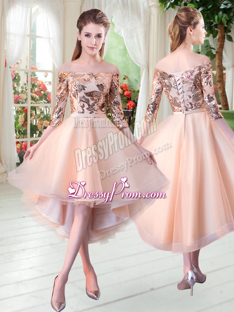 Neckline : Off the shoulderShown Color : PeachSilhouette : A-lineSleeve Length : 3|4 length sleeveHemline : high lowBack Detail : Lace upFabric : TulleEmbellishment : SequinsOccasion : Prom,PartySeason : Spring,Summer,Fall,Winter