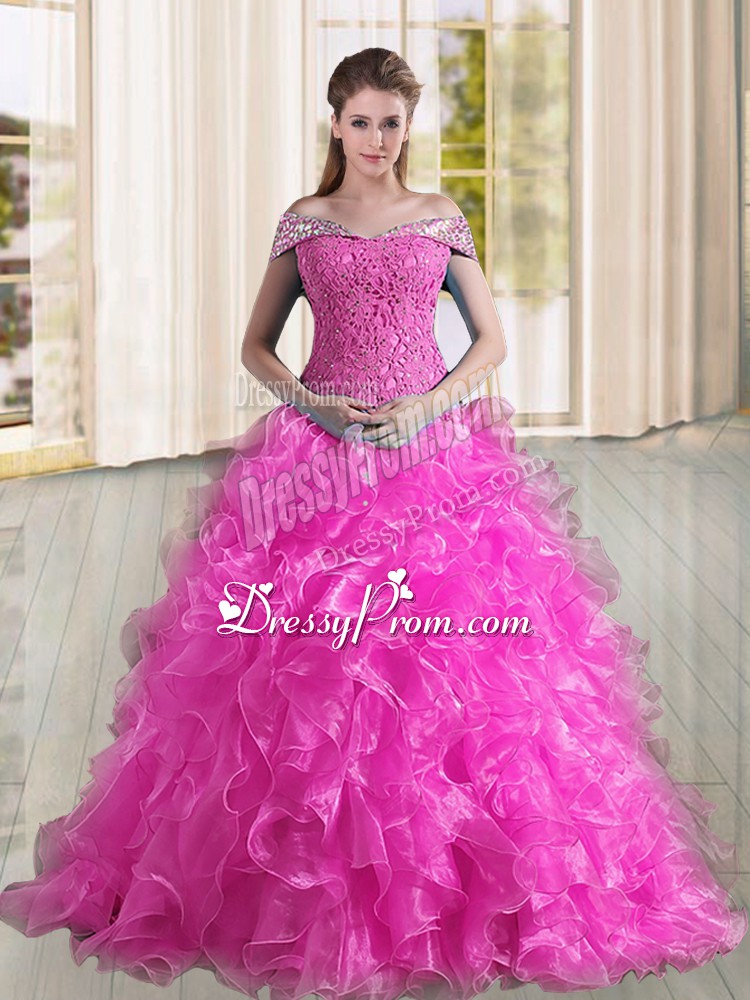 Neckline : Off the shoulder Shown Color : Fuchsia Silhouette : A-line Sleeve Length : sleeveless Back Detail : Lace up Fabric : Organza Embellishment : Beading,Lace,Ruffles Occasion : Military Ball,Sweet 16,Quinceanera Season : Spring,Summer,Fall,Winter