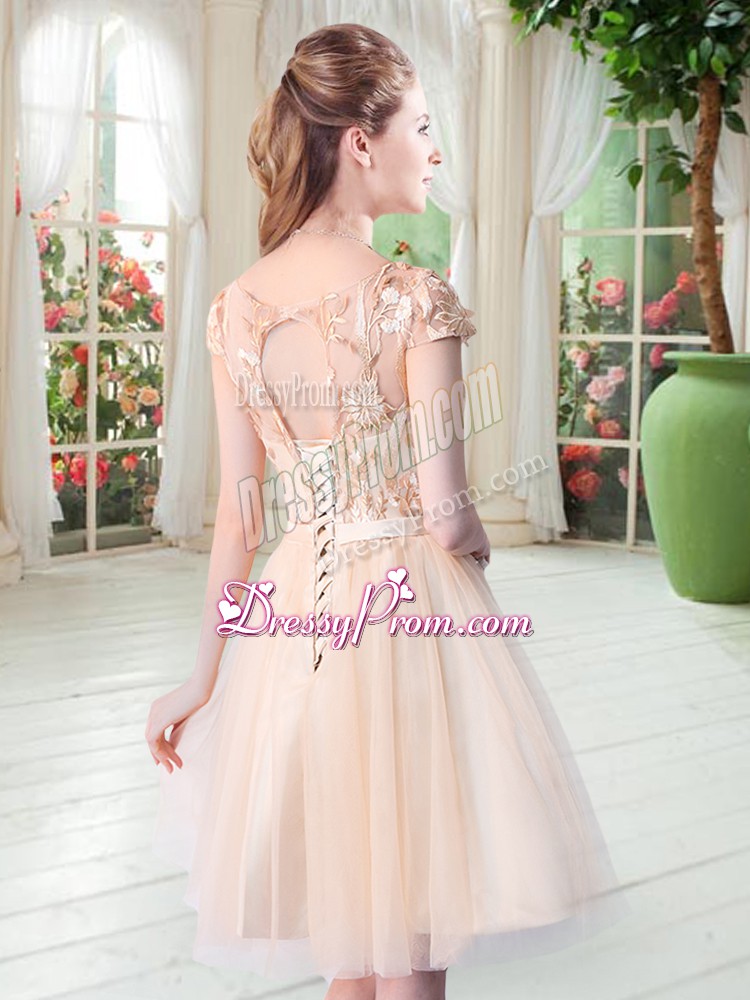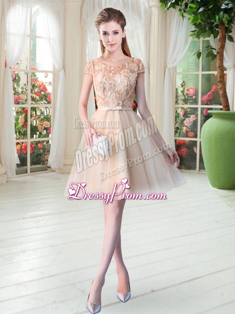 Neckline : ScoopShown Color : ChampagneSilhouette : A-lineSleeve Length : short sleevesHemline : mini lengthBack Detail : Lace upFabric : TulleEmbellishment : AppliquesOccasion : Prom,PartySeason : Spring,Summer,Fall
