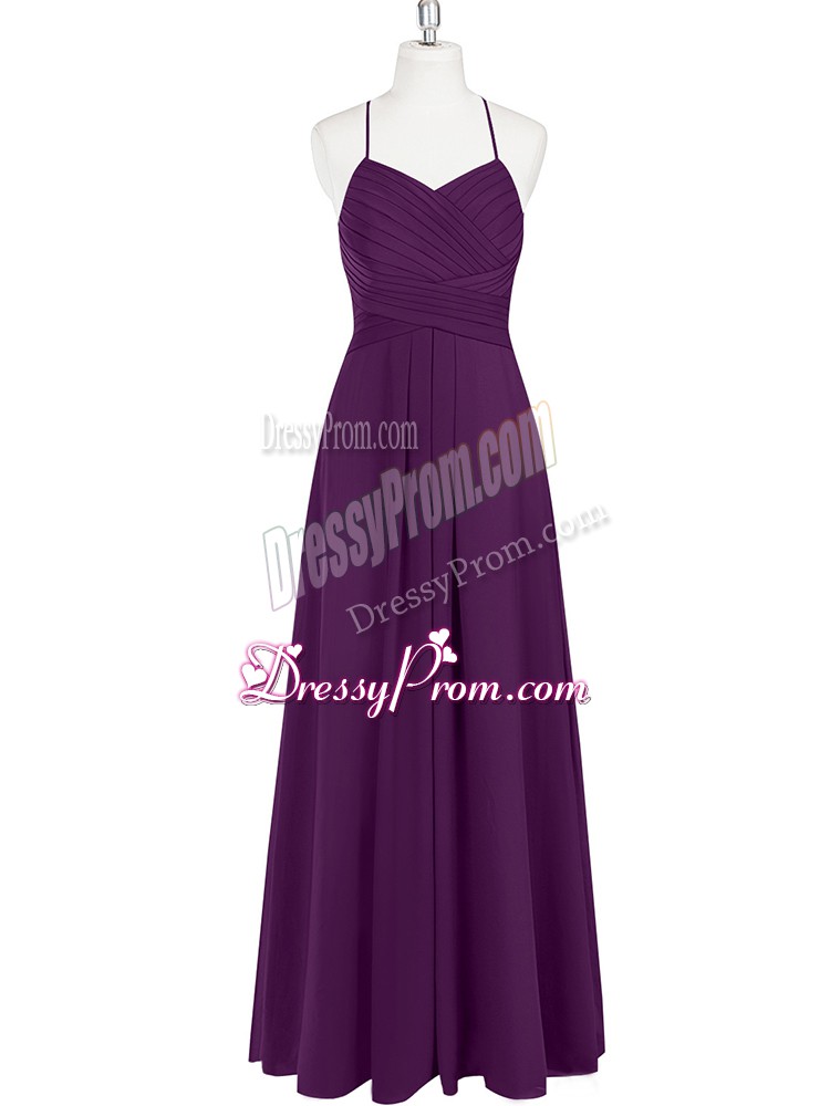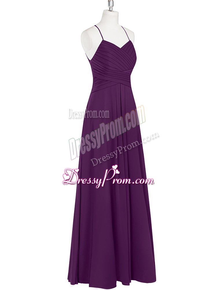 Neckline : StrapsShown Color : Eggplant PurpleSilhouette : EmpireSleeve Length : sleevelessHemline : floor lengthBack Detail : ZipperFabric : ChiffonEmbellishment : RuchingOccasion : Prom,PartySeason : Spring,Summer,Fall,Winter
