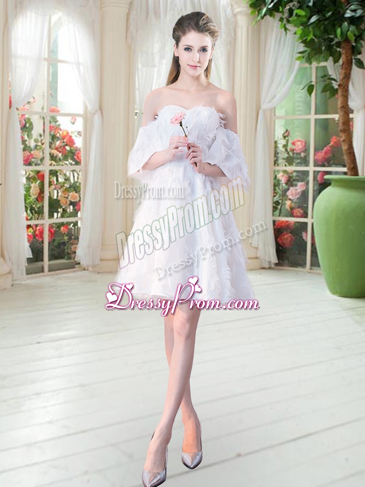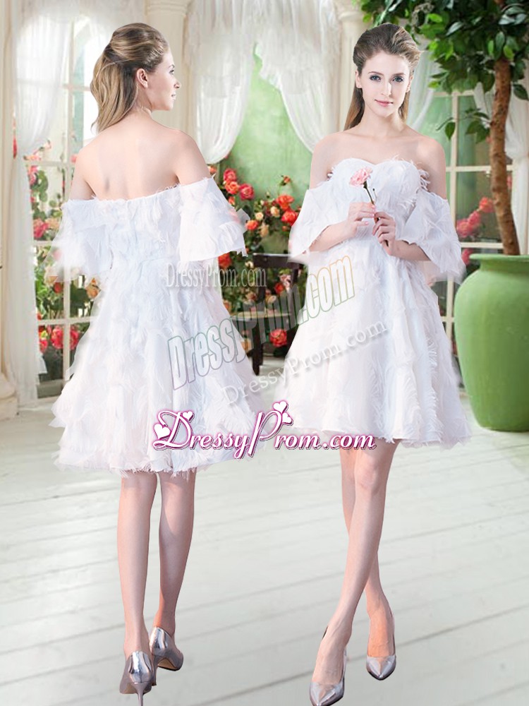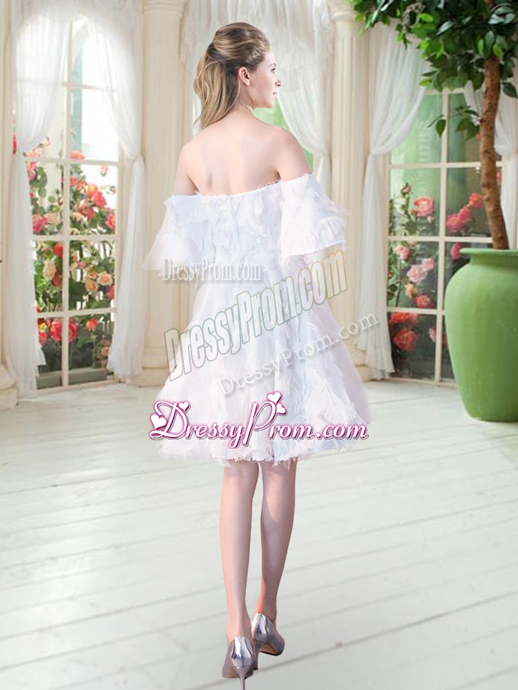 Neckline : Off the shoulder Shown Color : White Silhouette : A-line Sleeve Length : short sleeves Hemline : mini length Back Detail : Zipper Embellishment : Appliques Occasion : Prom,Party Season : Spring,Summer,Fall