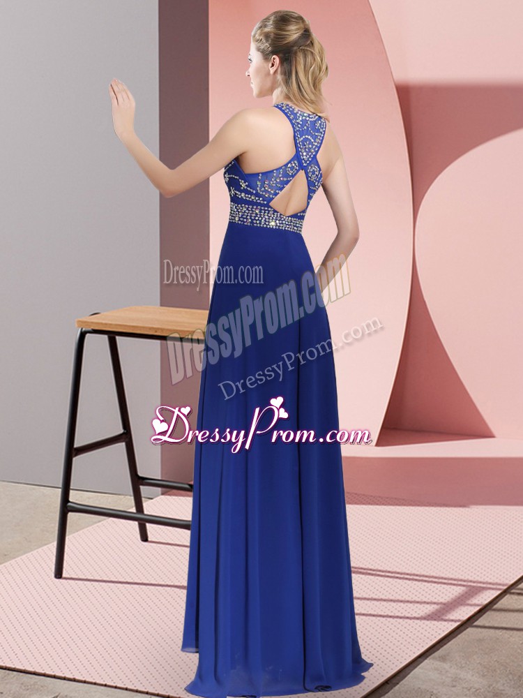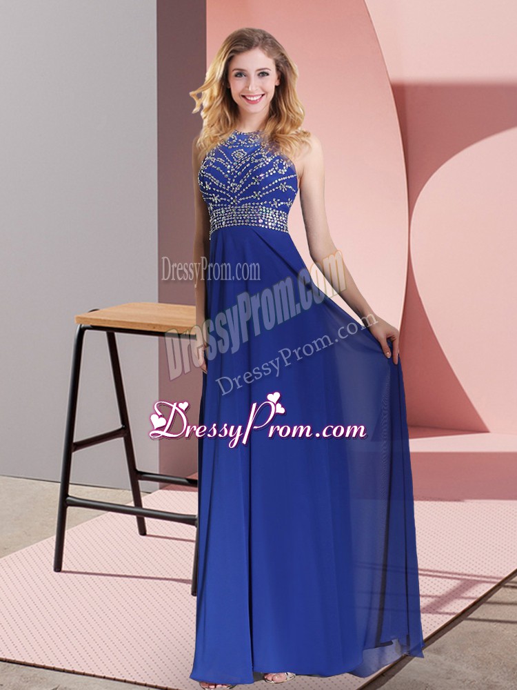 Neckline : High-neckShown Color : BlueSilhouette : EmpireSleeve Length : sleevelessBack Detail : Criss crossFabric : SatinEmbellishment : Beading,LaceOccasion : Prom,PartySeason : Spring,Summer,Fall,Winter