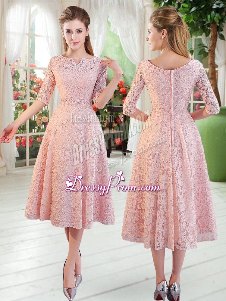 Neckline : Off the shoulderShown Color : Pink Silhouette : A-lineSleeve Length : half sleevesHemline : tea lengthBack Detail : ZipperFabric : LaceEmbellishment : BeadingOccasion : Prom,PartySeason : Spring,Summer,Fall,Winter