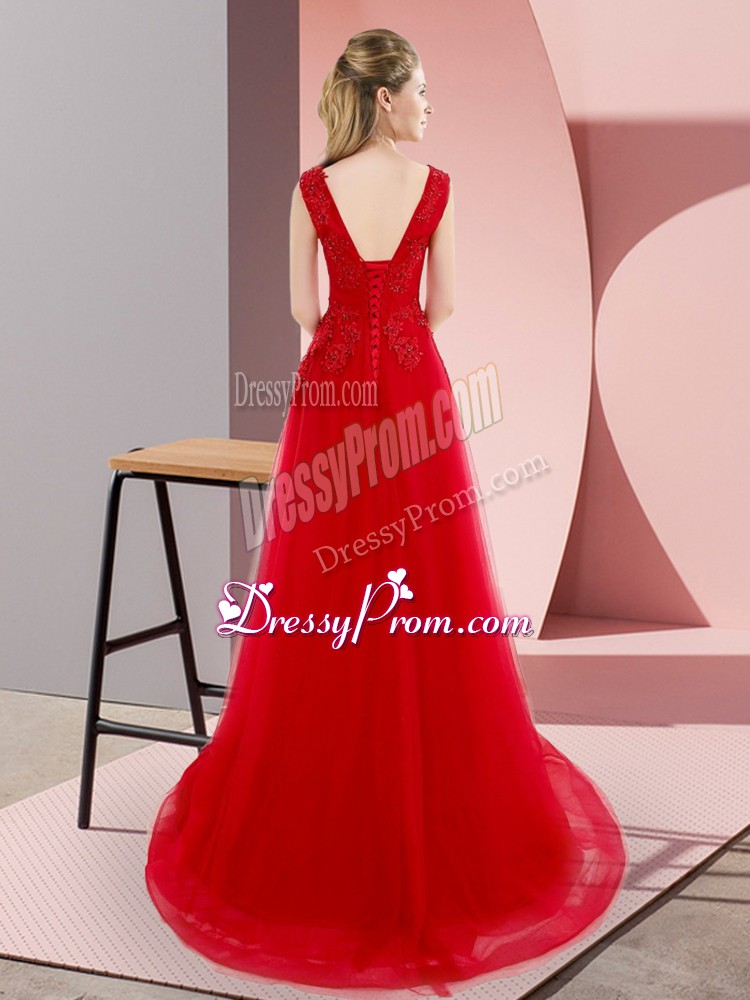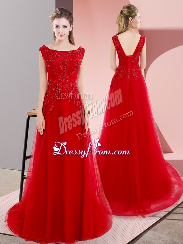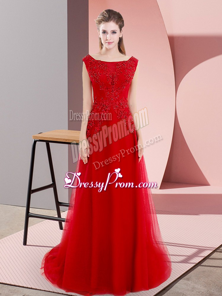 Neckline : BateauShown Color : RedSilhouette : EmpireSleeve Length : sleevelessBack Detail : Lace upFabric : TulleEmbellishment : Beading,AppliquesOccasion : Prom,Party,Military BallSeason : Spring,Summer,Fall,Winter