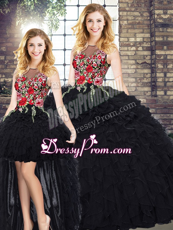 Neckline : ScoopShown Color : BlackSilhouette : Ball GownsSleeve Length : sleevelessHemline : floor lengthBack Detail : ZipperFabric : OrganzaEmbellishment : Embroidery,RufflesOccasion : Military Ball,Sweet 16,QuinceaneraSeason : Spring,Summer,Fall,Winter