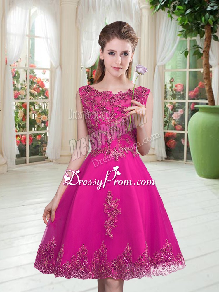 Neckline : ScoopShown Color : FuchsiaSilhouette : A-lineSleeve Length : sleevelessHemline : knee lengthBack Detail : Lace upFabric : TulleEmbellishment : Beading,AppliquesOccasion : Prom,PartySeason : Spring,Summer,Fall