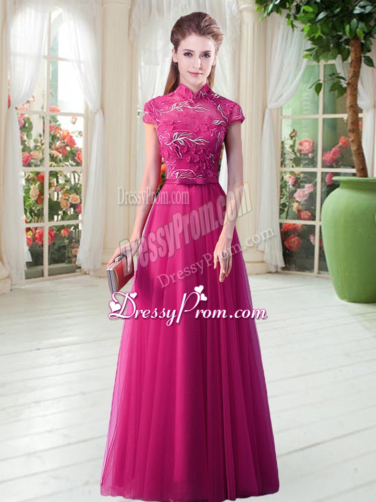 Neckline : High-neckShown Color : Hot PinkSilhouette : EmpireSleeve Length : short sleevesHemline : floor lengthBack Detail : Lace upFabric : TulleEmbellishment : LaceOccasion : Prom,PartySeason : Spring,Summer,Fall,Winter