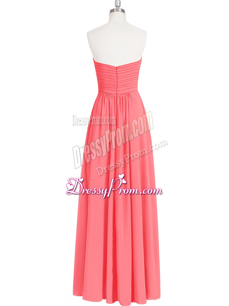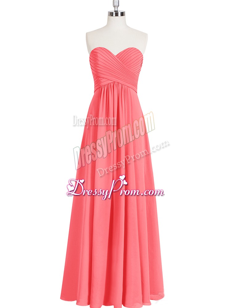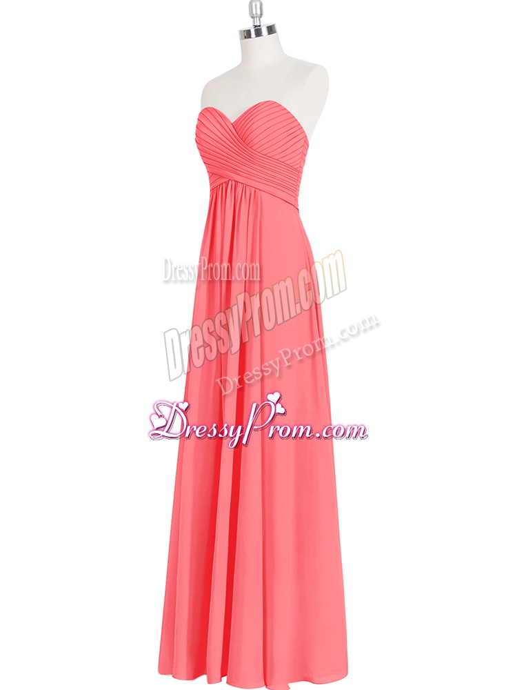 Neckline : SweetheartShown Color : Watermelon RedSilhouette : EmpireSleeve Length : sleevelessHemline : floor lengthBack Detail : ZipperFabric : ChiffonEmbellishment : RuchingOccasion : Prom,PartySeason : Spring,Summer,Fall,Winter