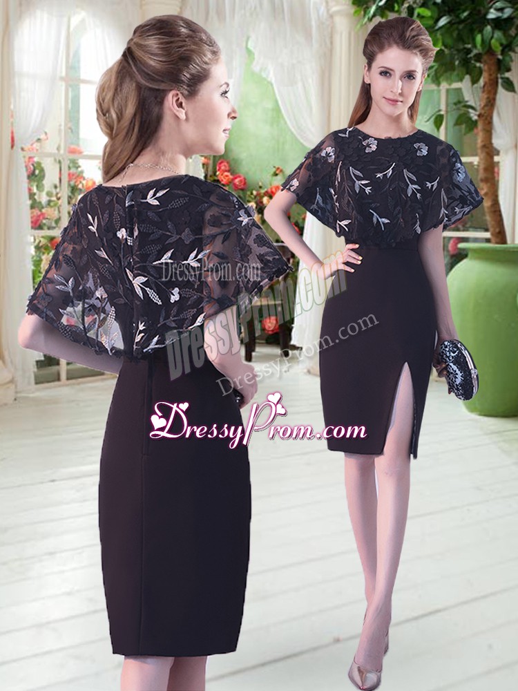 Neckline : ScoopShown Color : BlackSilhouette : Column/SheathSleeve Length : half sleevesHemline : knee lengthBack Detail : Lace upFabric : SatinEmbellishment : LaceOccasion : Prom,Party,Military BallSeason : Spring,Summer,Fall